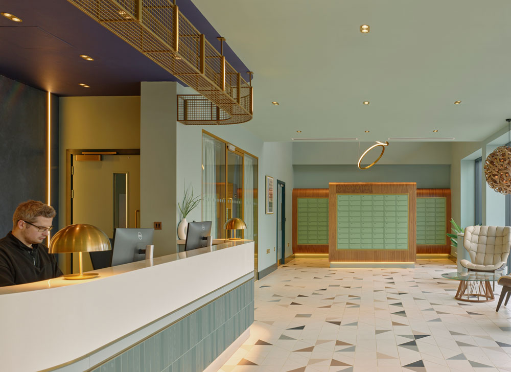 74 were appointed to create a coherent community in a new development of 261 residential Build to Rent apartments in Milton Keynes for their client Grainger plc. The amenity spaces consist of a concierge and entrance lounge, post and parcel areas with supporting management spaces at ground floor level.