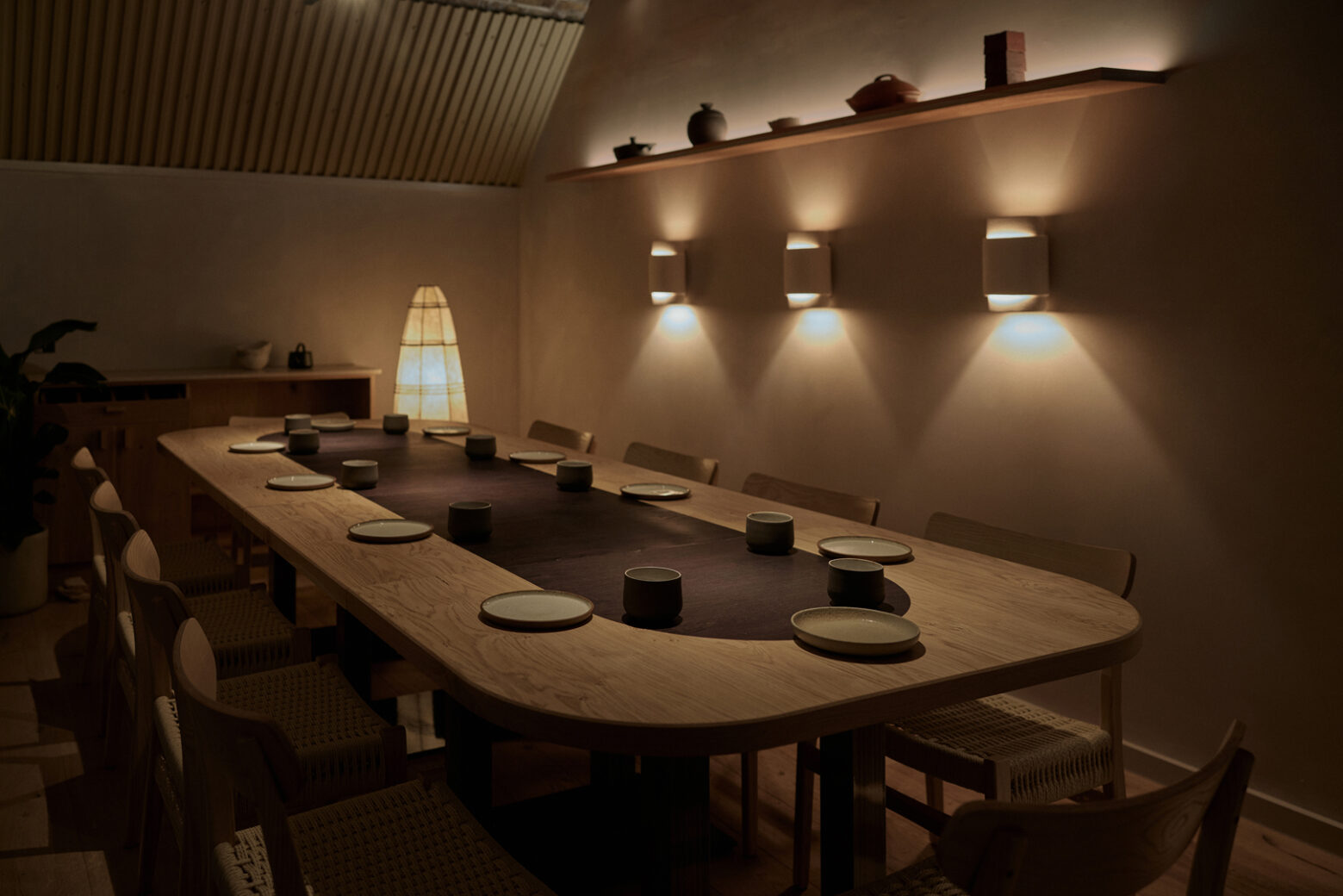Not usually a studio for following trends, A-nrd’s restaurant Akara taps into two trendy words of the moment: ‘minimaluxe’ and ‘quiet luxury’. Akara doesn’t shout, it whispers – created in collaboration with chef Aji Akokomi, this allows the colourful, punchy, flavoursome menu to do all the talking. To offset this neutral palette, the studio employed soft up-lighting, planting, contemporary art and authentic west-African objects and artifacts. Zoning the space is a buzzy cocktail bar crafted from carved oak, while tables and seats offer a sleek retreat alongside the more informal kitchen counter seating. Upstairs, a semi-private dining room offers a contrast in colour but also offers a coherence in its design.