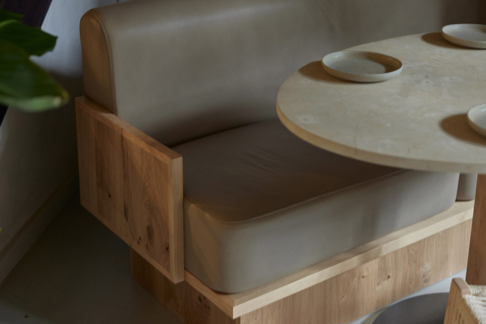 A-nrd respected the sites heritage wherever possible, incorporating elements such as the historical archways directly into the design concept. Renowned for their highly crafted approach to furniture design, the studio also created a large, oak sculptural table in Akara’s private dining room in the mezzanine above, which can be separated into four smaller components to maximise versatility. The rich, contrasting dark wood inlay in this piece offers a nod to black-eyed peas, one of the main ingredients used at Akara. Floor to ceiling curtains in an organic grey linen also allow the dining area to be completely private when drawn, or opened for a view of the restaurant below – for guests who want to feel semi-connected to the buzz below.