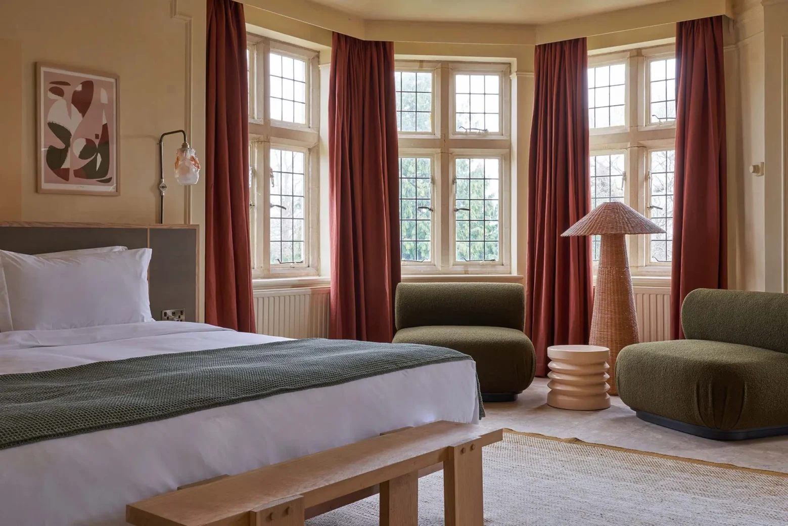 A-nrd also designed communal areas including the lobby, the Orangery, the Meadow Bar, Vervain (the all-day restaurant), the Snug, The Hive Co-Working Space, meeting rooms and all 181 bedrooms and suites. Working with small and local studios and artists, the interiors feature bespoke lighting crafted from recycled glass by Michael Ruh studio, whille recycled bouclu00e9 and linen fabrics from the Yarn Collective have been used on upholstery and curtains to add a great texture and depth. Larger guest rooms also feature a carbon negative light cork floor by Amorim, whilst smaller rooms feature sisal.