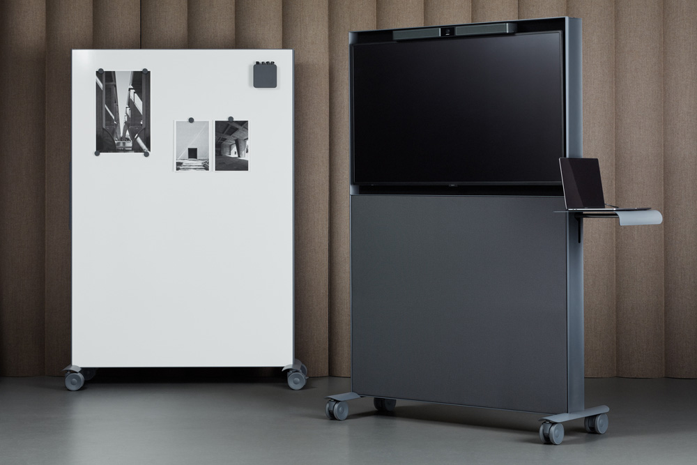 Designed by Studio Stockholm, Agile by Abstracta acts as a project workspace on wheels equipped with all the necessary tools. One side features a magnetic whiteboard and, on the other, a fully integrated, digital screen, speakers and camera, with a USB-C cable for powering peripherals.