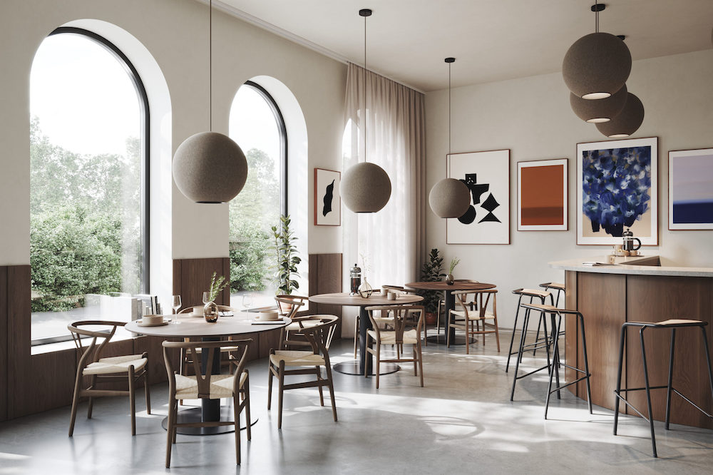 By combining two classic lamp shapes u2013 a globe, and a cone hidden within the globe u2013 Abstracta has created a recessed luminaire with a comfortable, downward, glare-free light, with exceptionally high performance acoustics. The core material is made of polyester made from 60% recycled PET plastic bottles. The outside felt is made of 90% recycled PET.