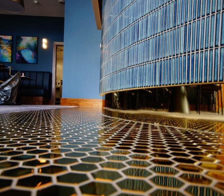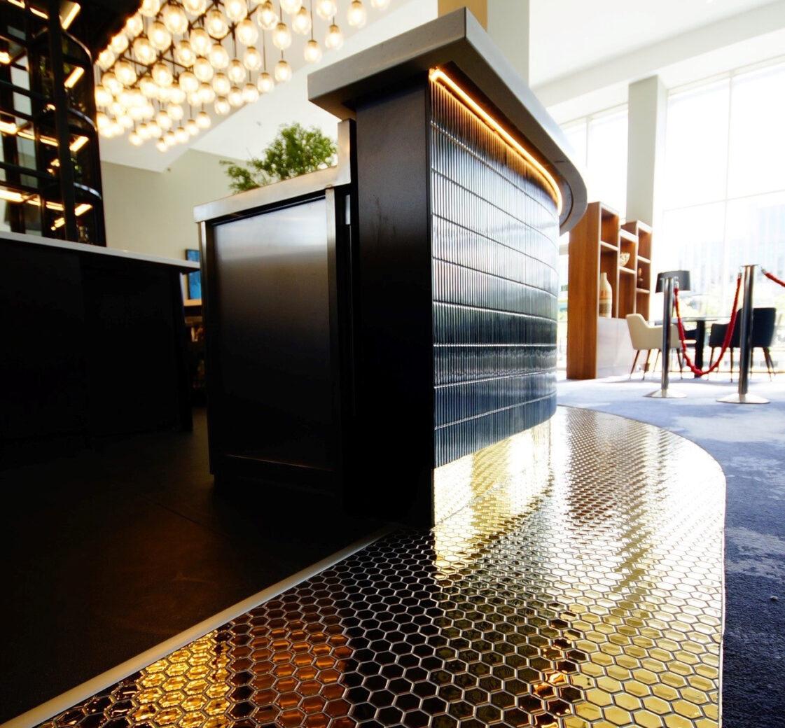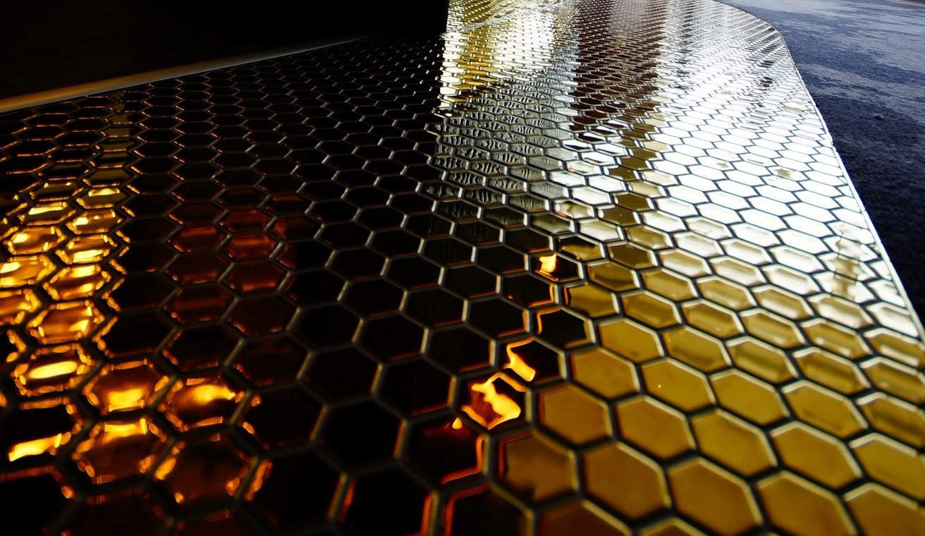 Strengthened using Titanium and Porcelain, the gold hexagonal mosaic of Architile’s Real Gold Hex range gives a frost, scratch, stain and slip resistant glaze with impressive aesthetics. The high intensity heat firing process of the mosaic, along with the refined blend of natural minerals (white clay, feldspar and kaolin) with added titanium, creates a hybrid and near indestructible glaze that will last the life of the building. The tiles are made using only electric kilns powered by solar panels with a high level of recycled materials, reusing raw natural minerals and reducing atmospheric pollution wherever possible.