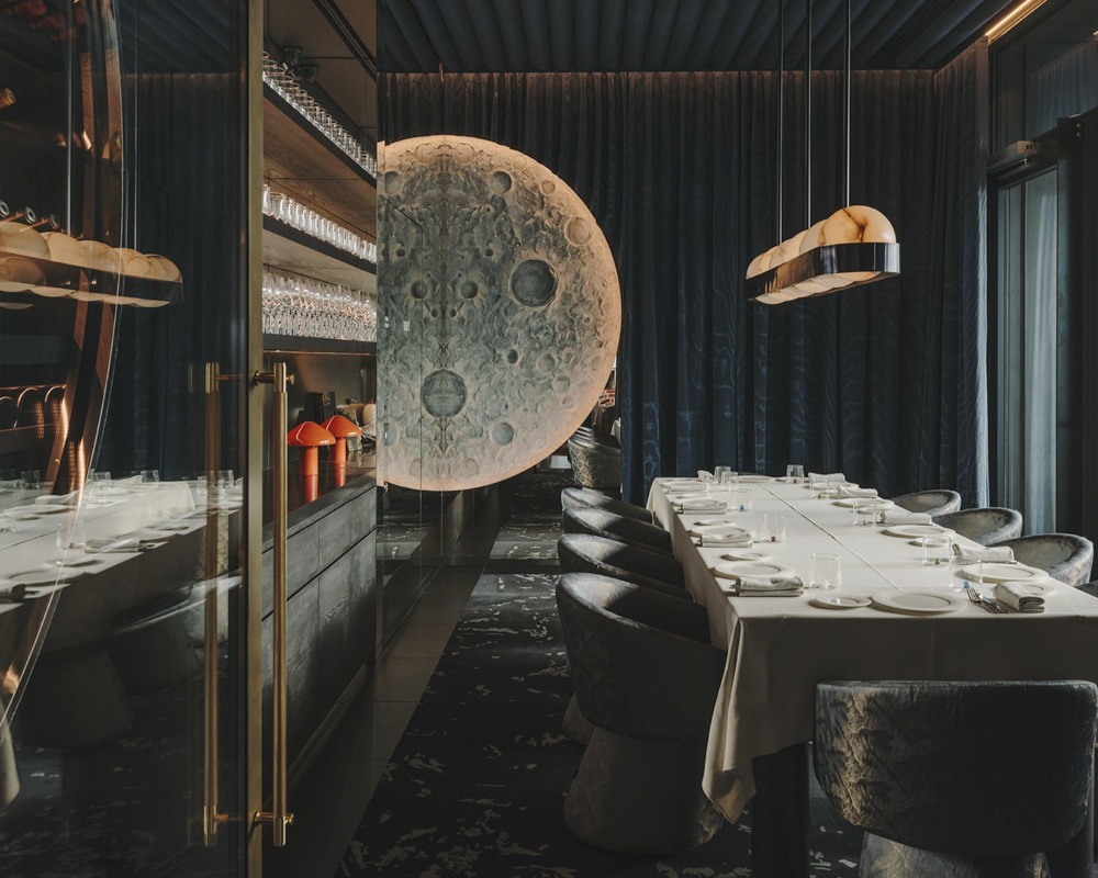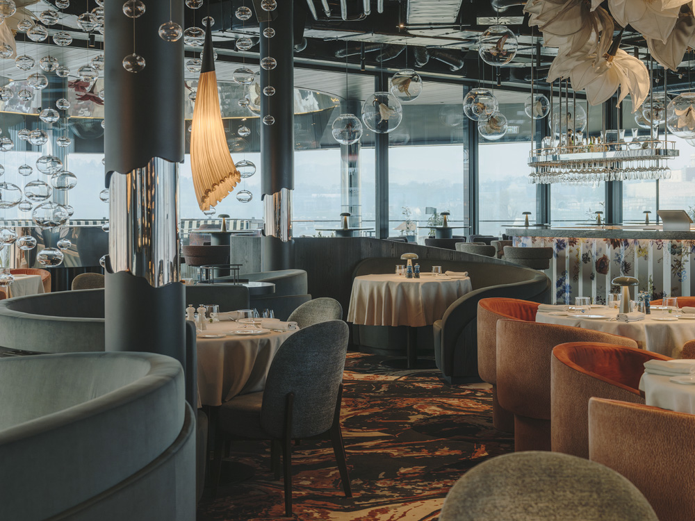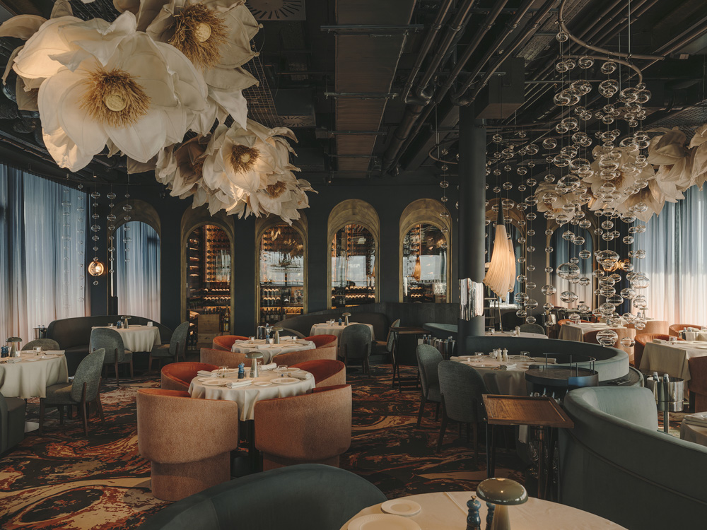 BIBO Budapest, located atop the Dorottya Hotel, is an avant-garde dining destination that fuses striking design with haute cuisine. Designed by Astet Studio, the interior immerses guests in an elegant, dreamlike world using reflective surfaces, sculptural forms and a deep blue palette. Monochrome curtains, mirrored installations and surrealist arches create a cosmic atmosphere, while organic banquettes and celestial-inspired carpets enhance intimacy. The Skybar and terrace, adorned with floral installations, offer breathtaking views, blending design, gastronomy and fantasy into an memorable experience.