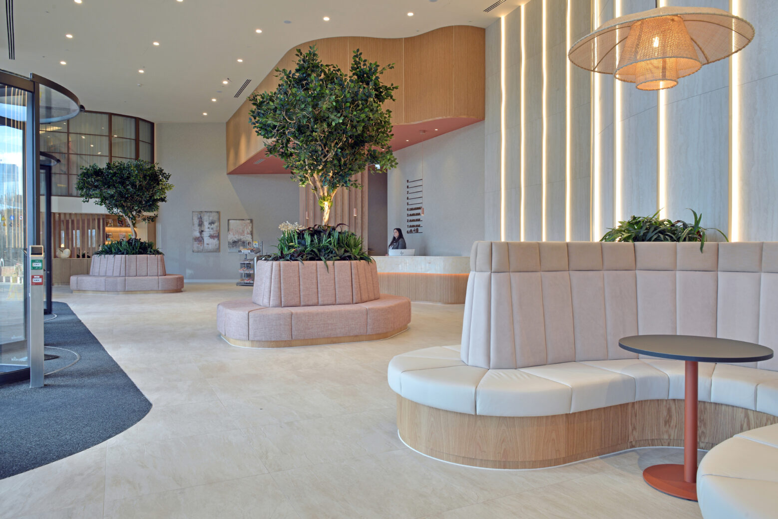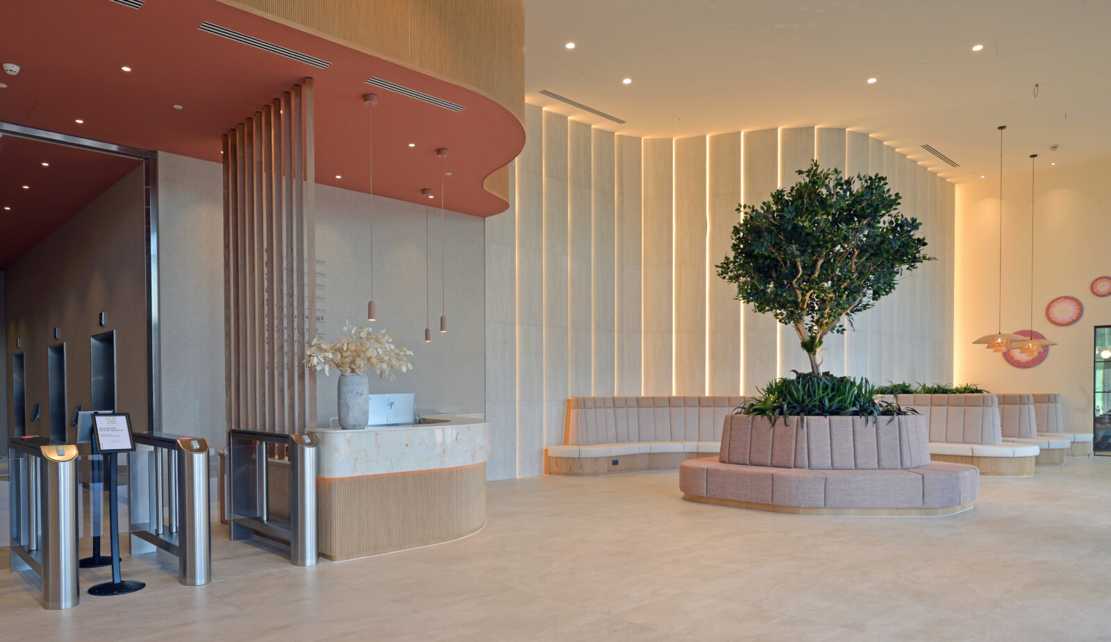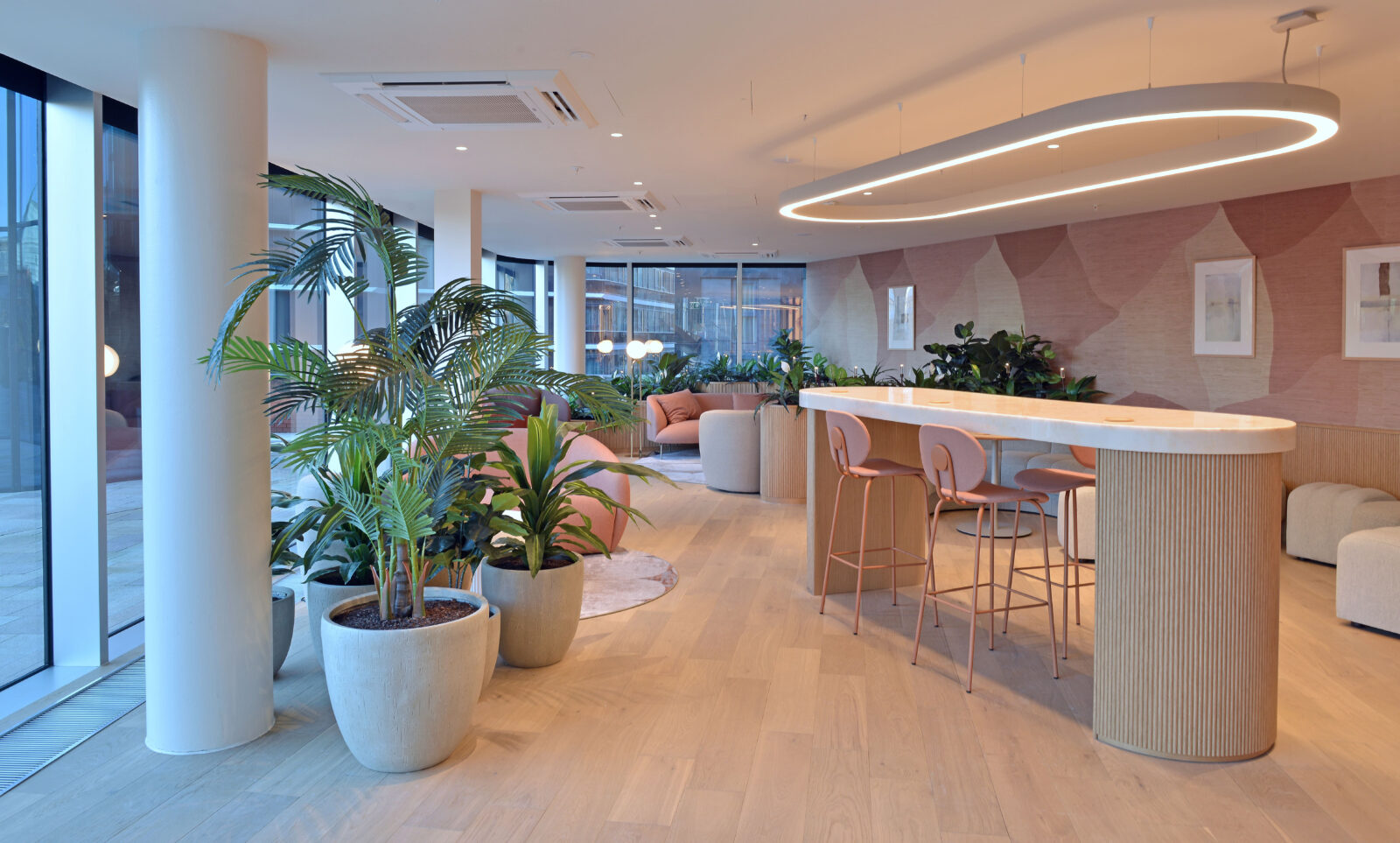 AXI delivered the new entrance spaces for 101 Embankment, an office building in Salford, Manchester. A refurbished, double-height reception space radiates warmth and comfort, in contrast to its formerly clinical atmosphere. A multifunctional mezzanine floor creates an inviting, intimate ambiance, while soft timber accents and textured wall finishes envelope a new adjoining lounge space. A luxurious end-of-journey bike storage and shower area complements the overall design of the new entrance spaces, with an emphasis on creating an inviting atmosphere to encourage cycling as a viable, eco-friendly commuting option.