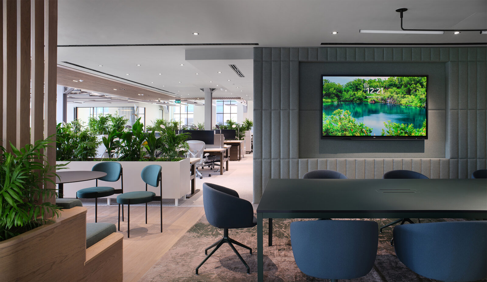 Grainhouse is a complex, heritage-led refurbishment that unifies and extends five buildings at the heart of Covent Garden. In addition to designing and delivering the basebuild works, Barr Gazetas also delivered the fit out design for Hines European HQ in London across the three upper floors of the building. Barr Gazetas worked with U.S concept Architects A+I to develop a design that combined Hines’ ethos and values with the history of the building. The three floors of this elegant new workspace are arranged around a striking spiral staircase, with extensive planting and a variety of green and blue tones, creating a stylish, calming environment.