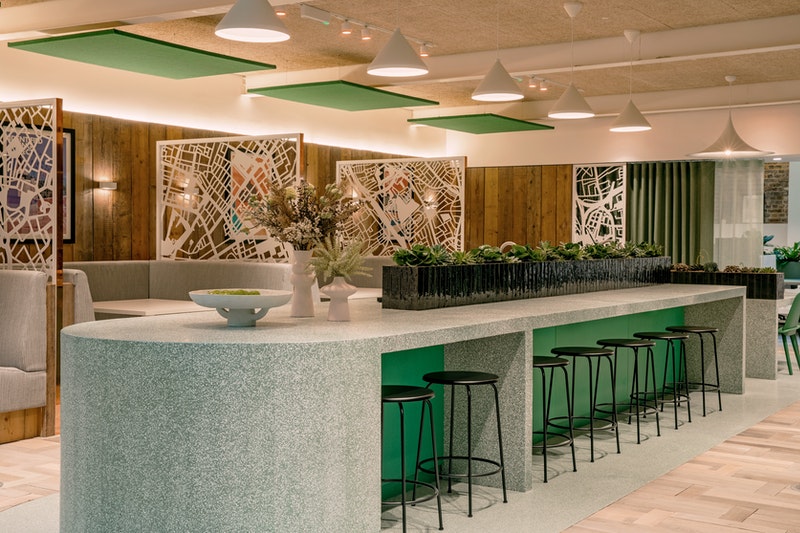 Sustainability and wellbeing sat at the heart of this project. The design team incorporated biophilic design strategies, opening views to natural light & views to King’s Cross, adding light refraction, variation and democratisation of space. The spaces engage through layering texture, colour, comfort and connecting with nature to create high quality experiences and optimisation of wellbeing. Through careful selection the design team incorporated colour & texture by repurposing existing timber floor, using materials in unexpected ways such as Cempanel flooring and wall cladding. Widespread natural surfaces, copper, lino, recycled leather, woodwool, Valchromat and paper pulp, plus air purifying paint.