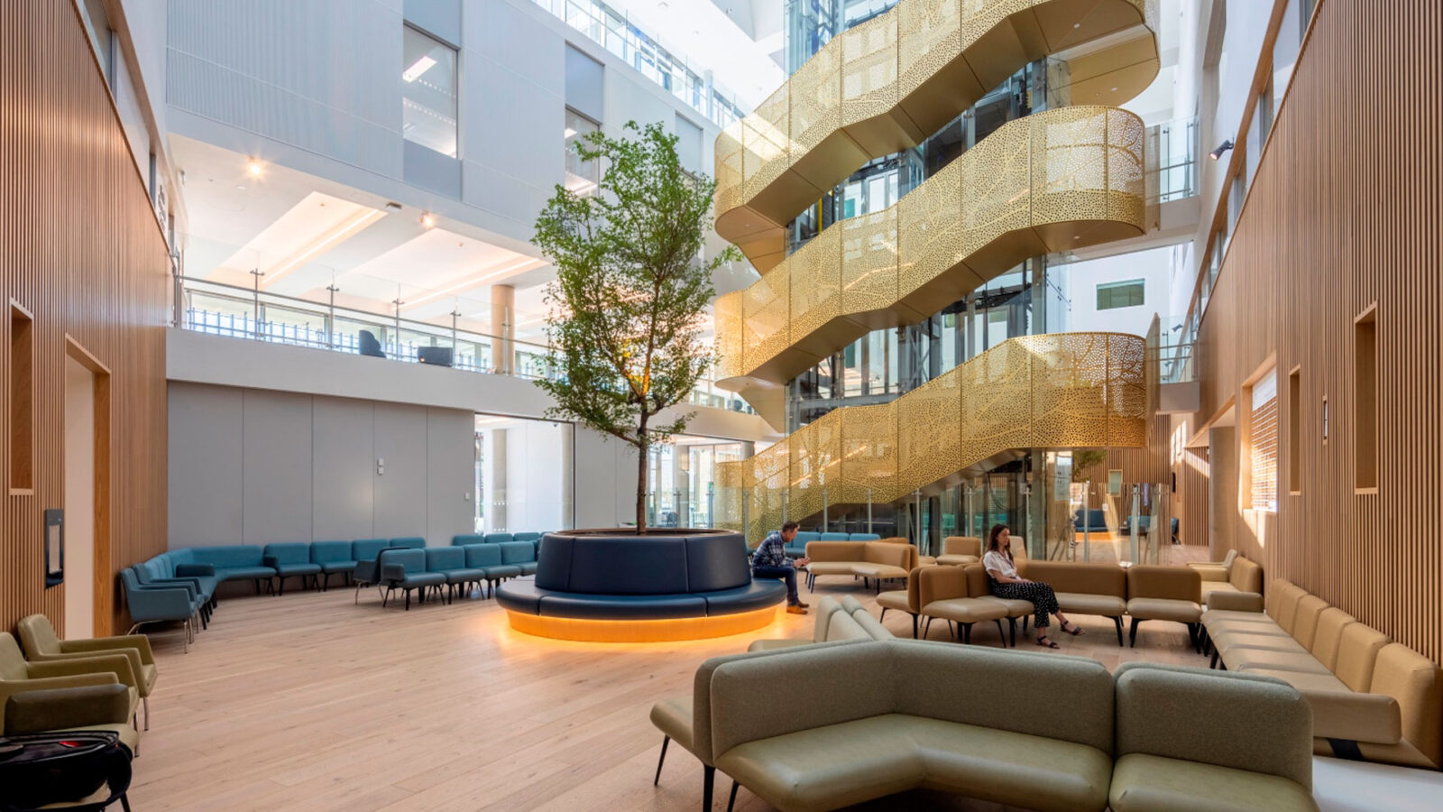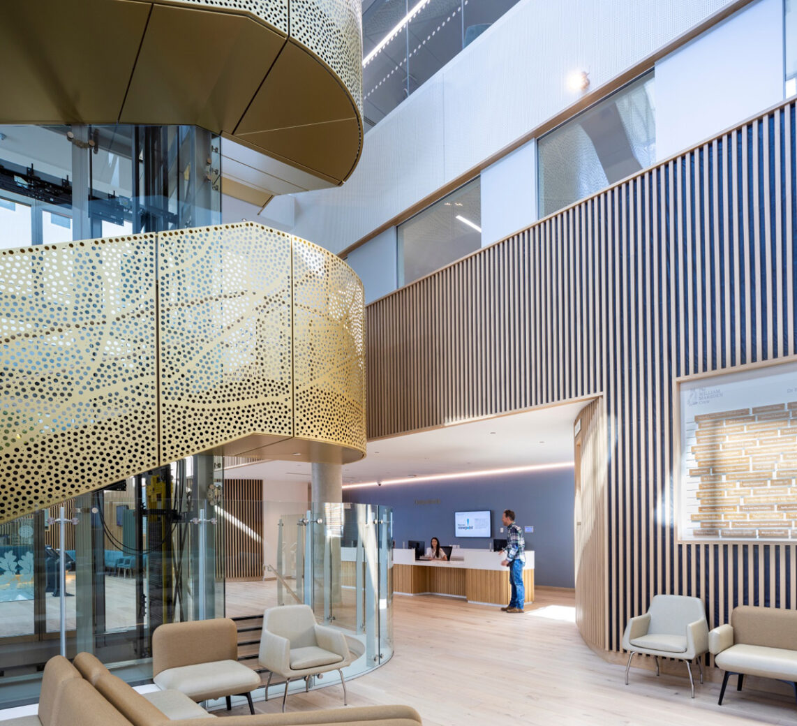 The Oak Cancer Centre is a new clinical care and research centre for the Royal Marsden NHS Foundation Trust’s Sutton hospital campus. The Royal Marsden Hospital opened in 1851 as the world’s first hospital dedicated to cancer diagnosis, treatment, research, and education, and the reimagined building has been designed by BDP with the aim of projecting a strong sense of optimism and to create as positive experience as possible for all those that interact with it: patients, their families and friends, the dedicated staff and the wider community.