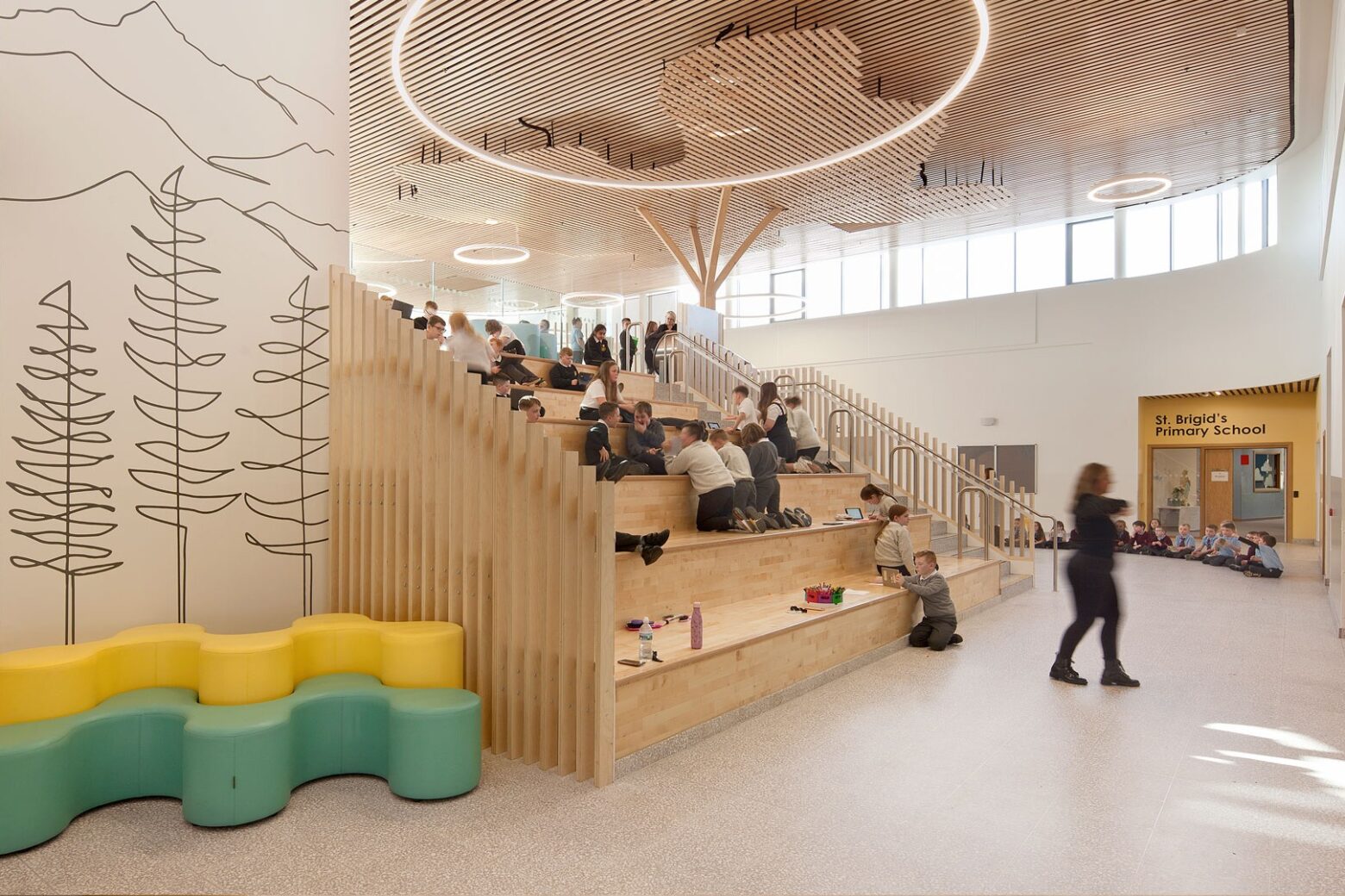 Schools are at the heart of any healthy community, and recognising this, North Lanarkshire Council committed to an ambitious investment programme for its schools. Newmains and St Brigid’s Community Hub, designed by BDP, is one of the key projects in the programme. The project brings together Newmains Primary School, St. Brigid’s Primary School, and a family learning centre for pre school children as well as a range of community focussed facilities into a unified, sustainable and welcoming campus in the heart of the neighbourhood of Newmains.