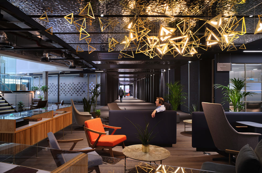 The existing client lounge and support spaces have been completely re-imagined providing an enhanced multi-functional facility for guests and staff. To bring a sense of local identity to the space, a bespoke feature ceiling was used in the transition space to stunning effect in reference to the nearby River Thames. This truly immersive experience leads to a new meeting room configuration connecting through to a naturally lit atrium creating much-needed connectivity between the spaces.