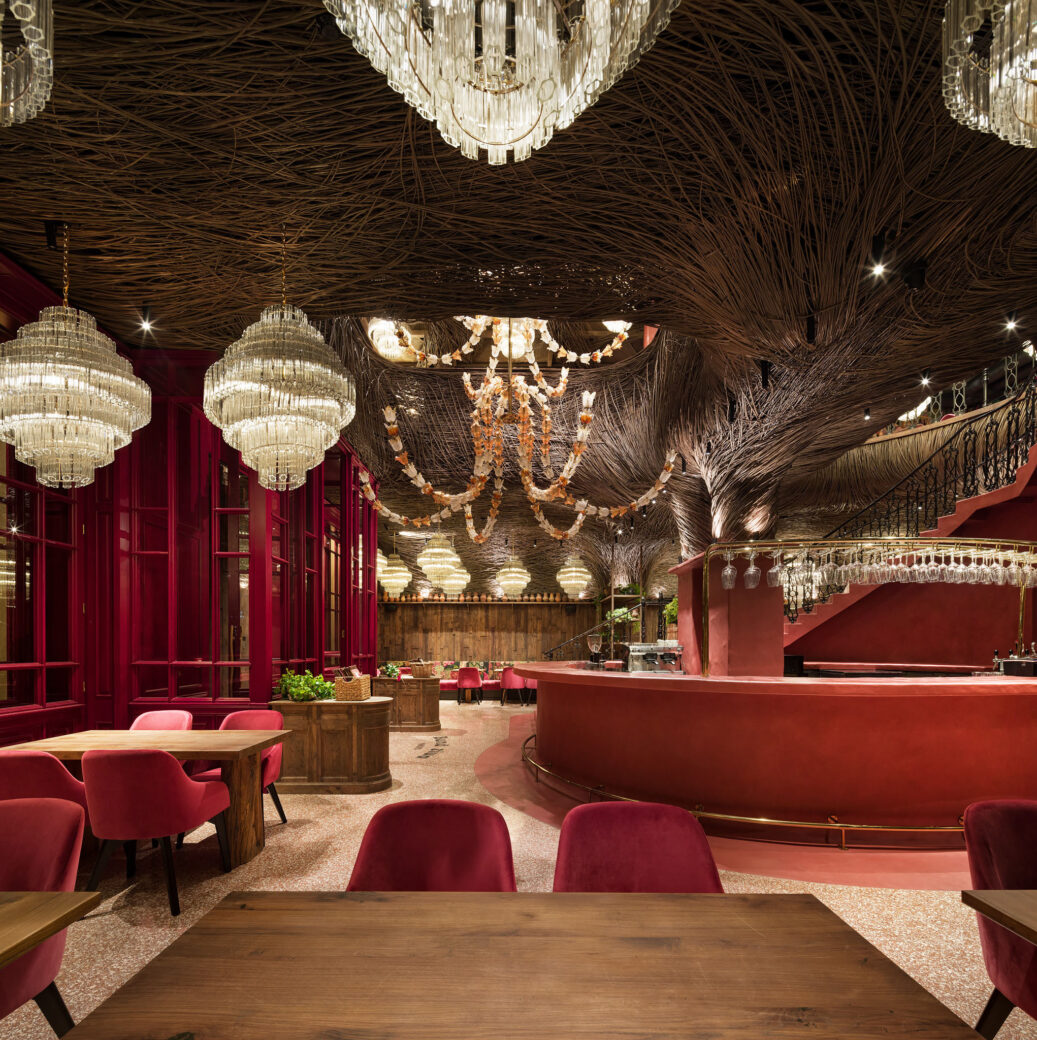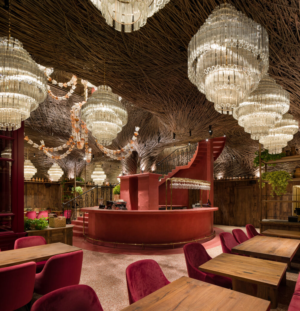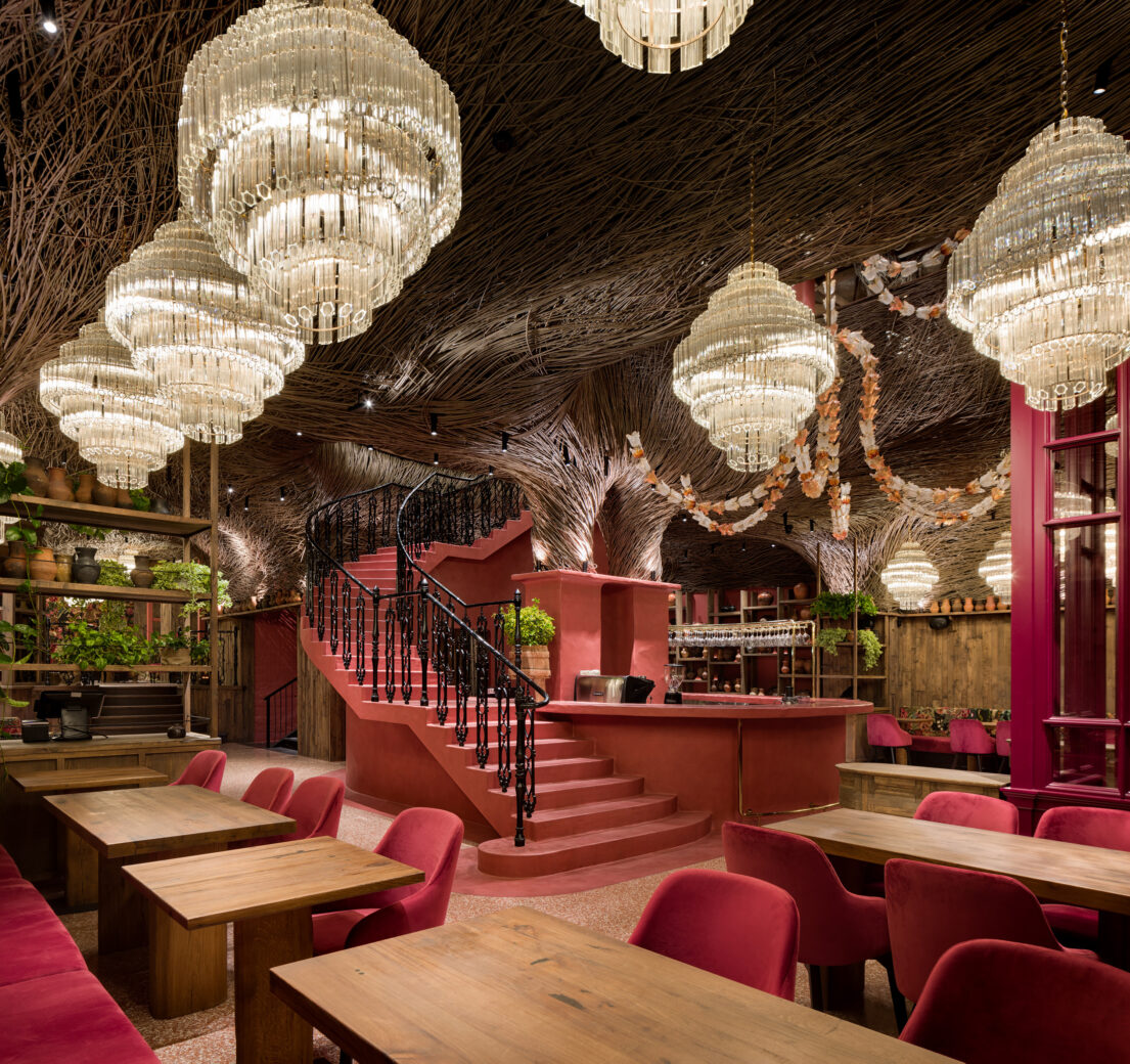 Aiming to create a harmonious blend of eco and ethnic styles, Mamaliga restaurant by Belenko Design spans two floors and a terrace. The practice designed clay-effect bar counters for both floors using microcement and the stairs are similarly crafted with the addition of wrought iron balusters. Natural, eco-friendly materials were one of the important aspects of the space, with the u2018grapevine’ that entwines the ceiling made with hazel and willow and the walls clad with aged, recycled wood. Mamaliga also embraces the Bessarabian ethnic style, reflecting its cultural proximity to Ukraine u2013 walls are adorned with antique Bessarabian patchwork carpets, all soft furniture is upholstered with traditional textiles, and clay pitchers and amphora-shaped sinks add rustic charm throughout.