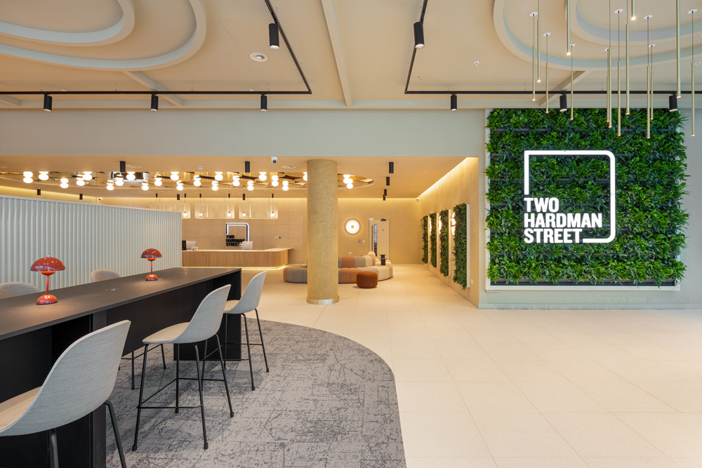 Mid-pandemic, Bluesky Design were given the exciting opportunity to reimagine a prominent site at 2 Hardman Street in the heart of Spinningfields in Manchester. Their client, HANSAINVEST, wanted to break free from the corporate look, and deliver a new vision to the marketplace by creating an ‘informal comfortable welcoming environment’.