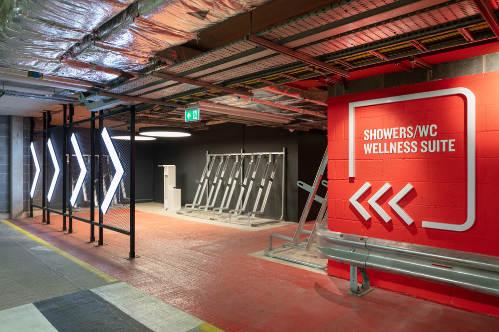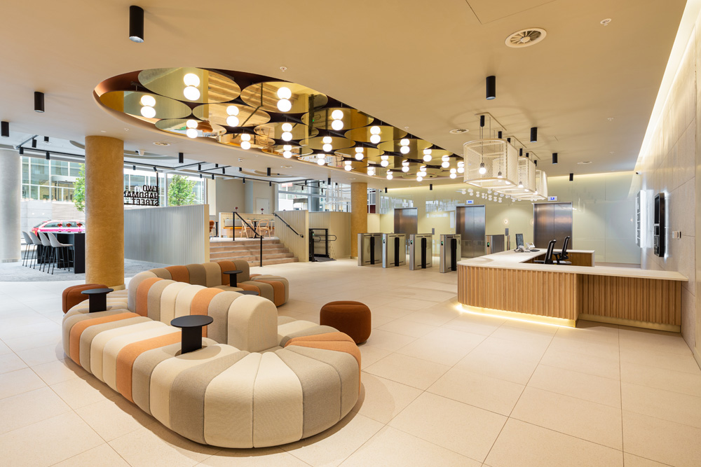 The scope of works covered the 4,000 sq ft ground floor reception and extended out to the basement carpark where a new wellness facility was to be introduced including bike store, showers and yoga studio. Inside, a new reception and café bar was developed to be used by the building’s tenants and wider business community.