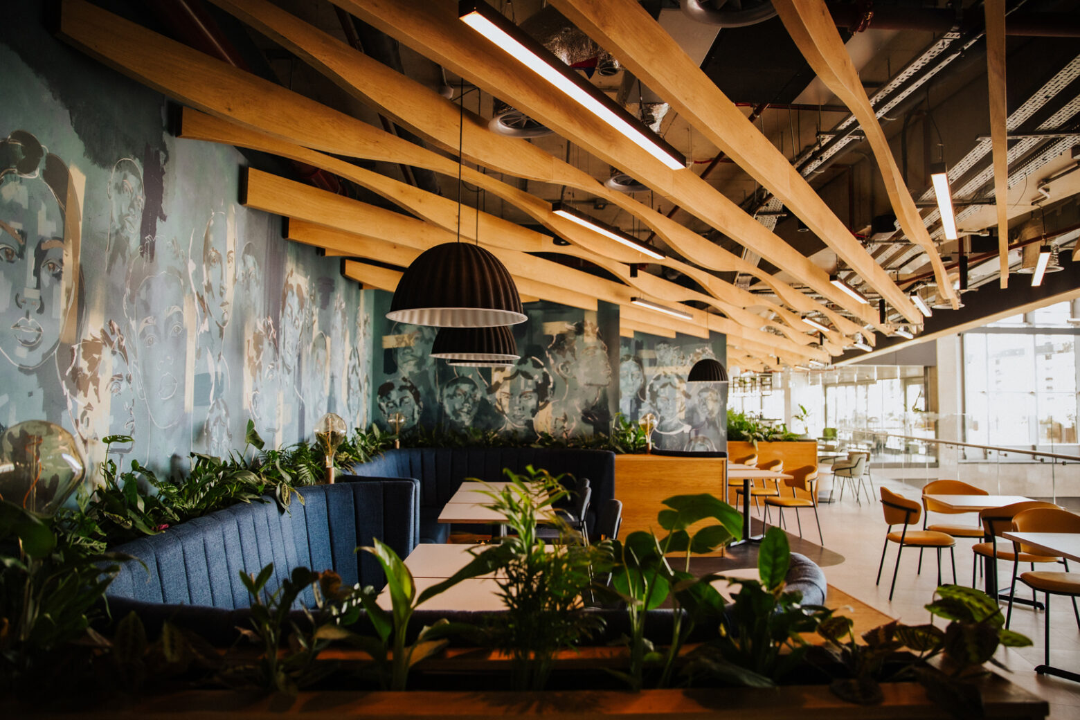 When designing Unity Sky Lounge (envisioned as a multi-purpose destination bringing together community, business and leisure), CDS Wilman partnered with eco-conscious suppliers such as EGGER, Johnstones and Protocol, alongside local subcontractors to further support the local economy. Needing to keep the space feel as open and flexible as possible, planting dividers have also been carefully used to create different seating zones, while guiding the customer through the space and adding a biophilic touch.