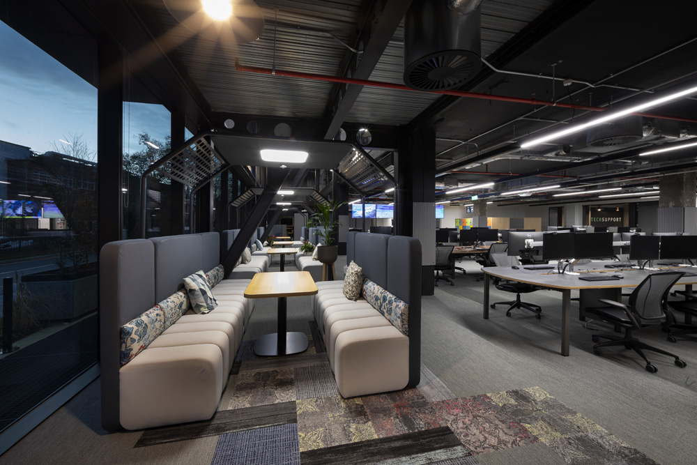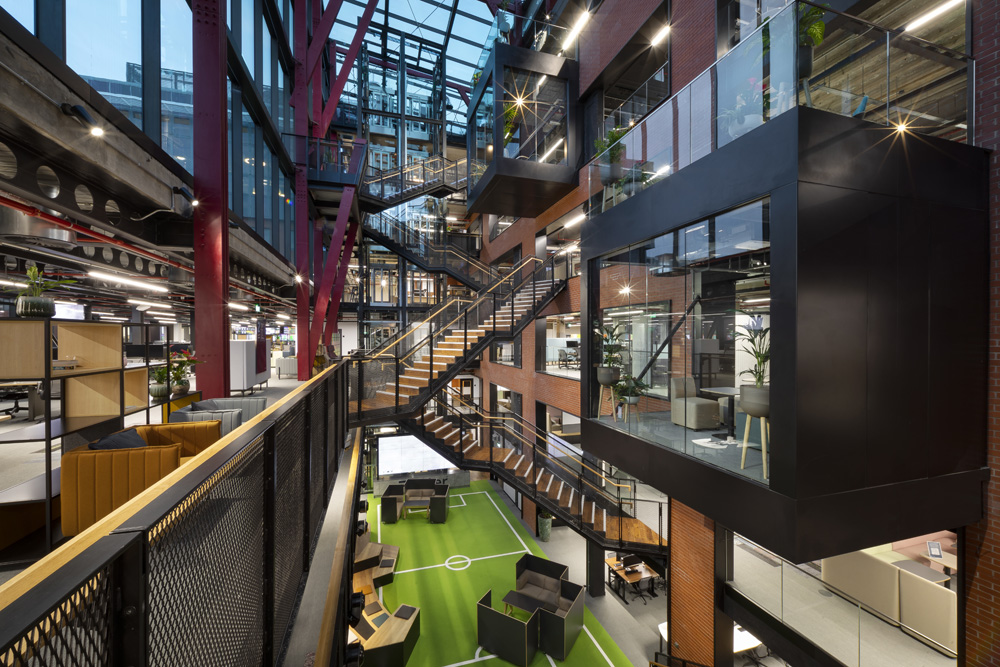 UK-based interior design and fit-out business Claremont Group Interiors called Flutter its most ambitious and challenging to date. Home to 1700 employees, Flutter includes a new statement glazed atrium, 110 meeting spaces, 227 agile spaces and 1070 seated positions and some creative ‘Flutter features’ – such as entering the building through a football tunnel onto a pitch.