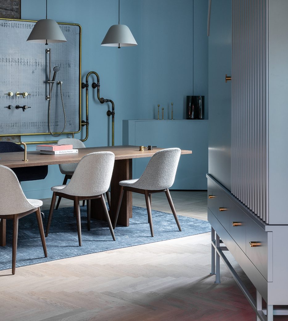 The Market Building is a new experience-led showroom in Clerkenwell. Created by interior architects Holloway Li, the space showcases Coalbrook products and celebrates the brand’s heritage, evoking industrial forms and materiality. The ground floor is designed to appear like a landscape of industrial chimneys, with ghostly casts of Victorian bathroom wall panels in orange and amber resin, which glow like furnaces. Shower displays are mounted onto ‘chimneys’ and situated beneath chainmail curtains. A solid stone, post-tensioned staircase with rough quarried edges leads down to the basement level, where two large industrial boilerlike structures house working tap displays. The innovative new showroom is also home to Davroc’s Bard & Brazier, who designed display units fabricated from brass tubing, and Bard & Blackwood who crafted the bespoke joinery.
