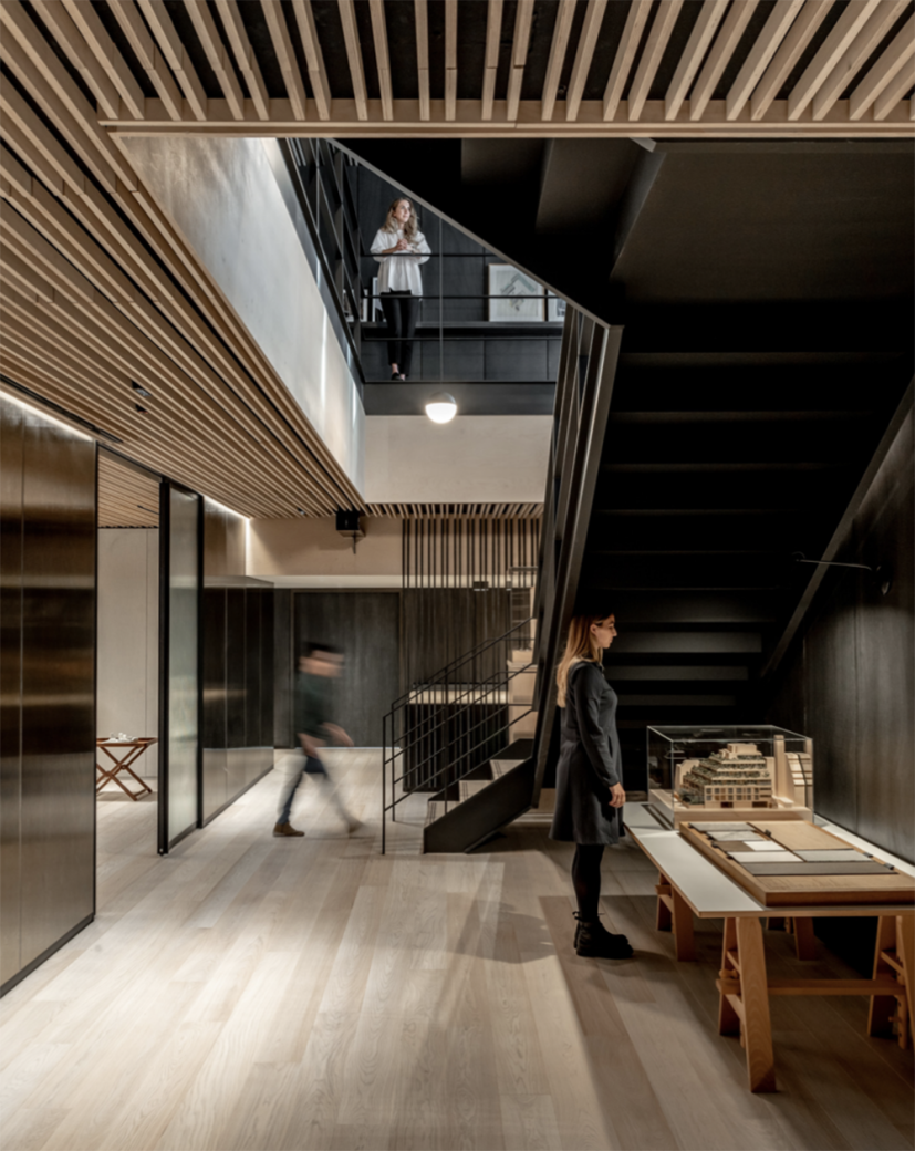 Despite overblown predictions of the demise of the office as an institution, for Conran and Partners the pandemic highlighted the importance of a place of work that creates a sense of belonging, and stimulates creative collaboration; and for that space to be desirable and to attract and retain the very best team, to entice people away from home-working. default. The new Clerkenwell studio is a continuous flow of spaces, without formal or traditional hierarchies, over two floors, connected by naturally-lit double-height volumes at either end. Designed as an enfilade through the use of large translucent sliding screens that allow privacy or connectedness, and create changing vistas, animated by a landscape of lighting and furniture, throughout the studio.