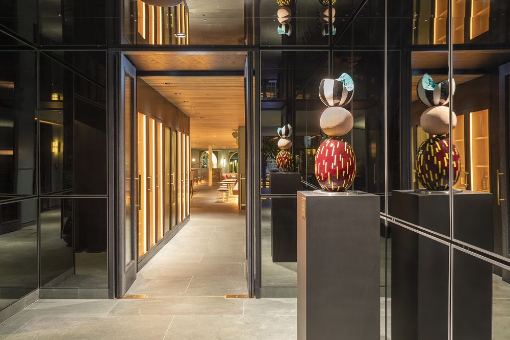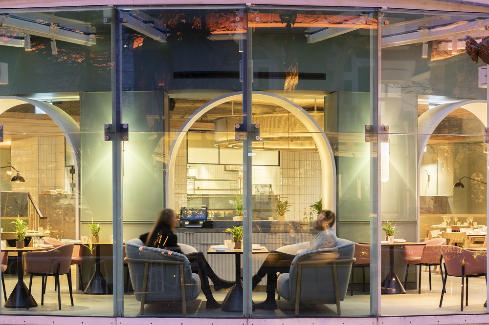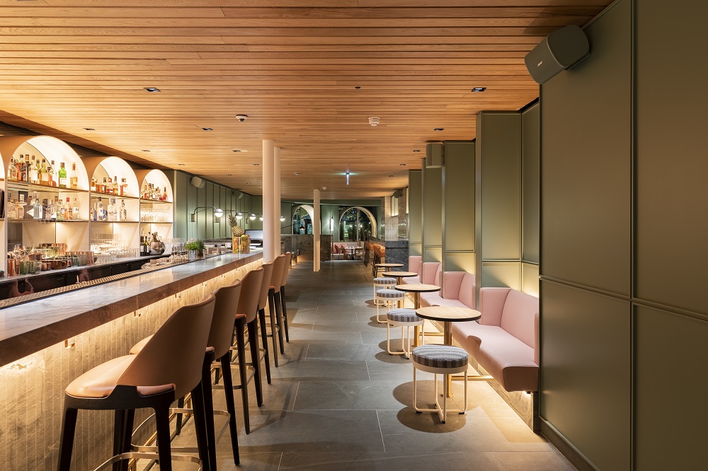 The design of the space in its Victorian setting facing the listed courtyard with its landscaping and historic fountain alongside the glazed winter garden led to an English garden inspired design concept that manifests itself both in the materiality as well as the artwork commissioned for the space. Bringing the outside in, the design carries a light and airy feel throughout, with views into the listed courtyard and fountain of the hotel. The stunning dining room where elegant wood cladding and a soft colour palette create a relaxing environment for guests.