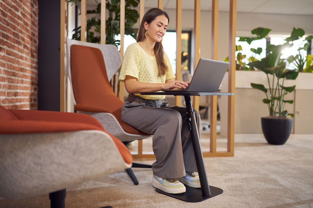The Bento laptop table, available in black and white, is designed for activity-based working environments but works and looks great almost everywhere. It has a safe, intuitive height adjustment mechanism and is suitable for soft seating and (task) chair environments. The combination of a flat, stable base and angled pole, offer best in class stability, easy mobility on both hard floors and carpets and gives you more legroom and reach. With its small stature and big personality, the Bento laptop table is a perfect addition to any workplace.