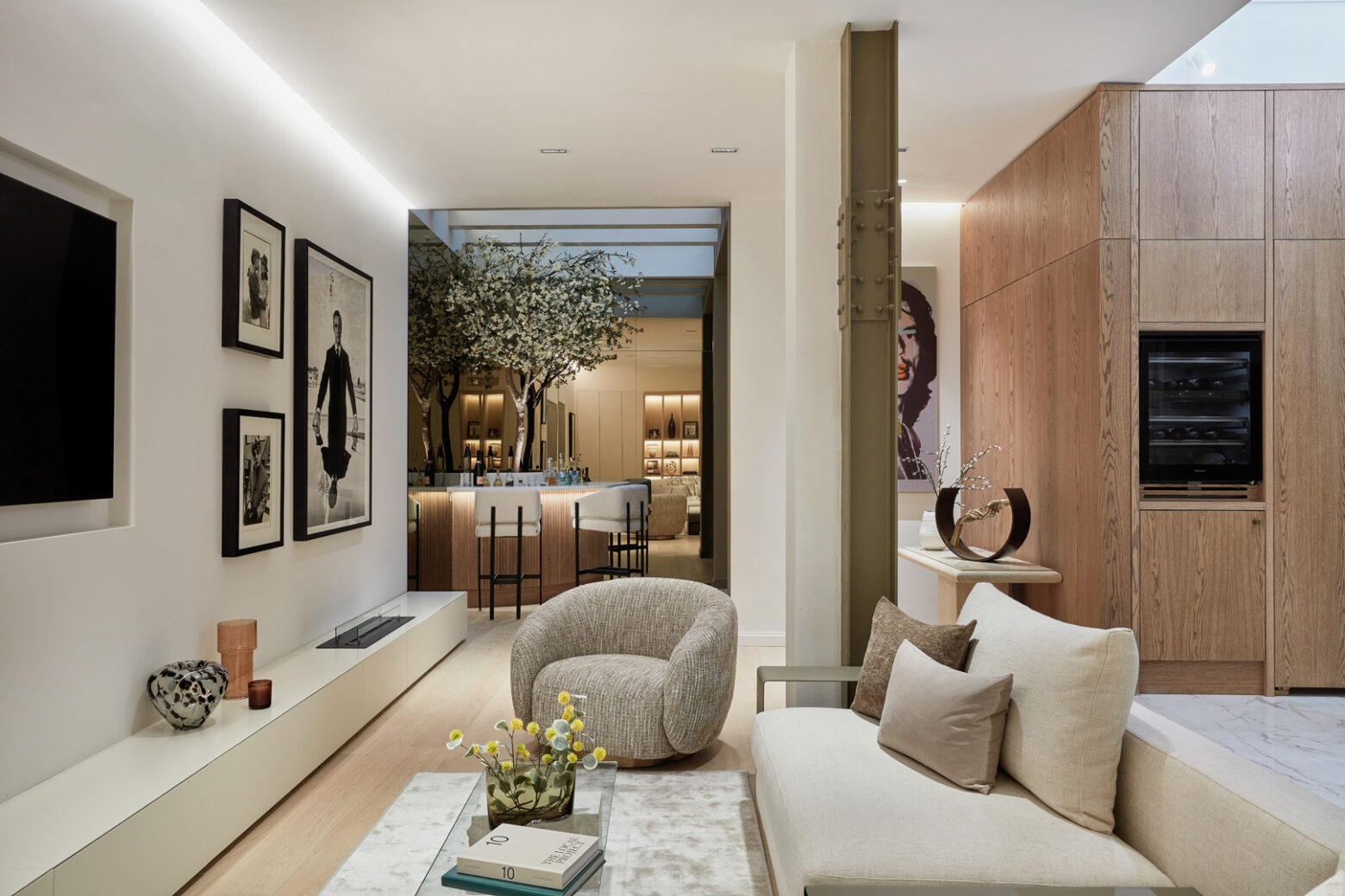 Tucked away behind Buckingham Palace is a four-storey, four-bedroom house on secluded Grosvenor Crescent Mews, moments from Hyde Park Corner and St James’s Park. The original Victorian building interior has been meticulously remodelled and augmented to be a masterclass in contemporary, light-filled London living. The home is characterised by uncompromising craftsmanship, with a new focal point, a central skylight filtering natural daylight through all four storeys via glass walls and floors. Renovating the property for Sethia London, Design With Narrative has drawn on the area’s rich history to blend heritage features with contemporary, sophisticated luxury. A palette of neutral shades, light and dark woods, soft bronzes and reeded glass is joined by pops of colour through striking artwork.