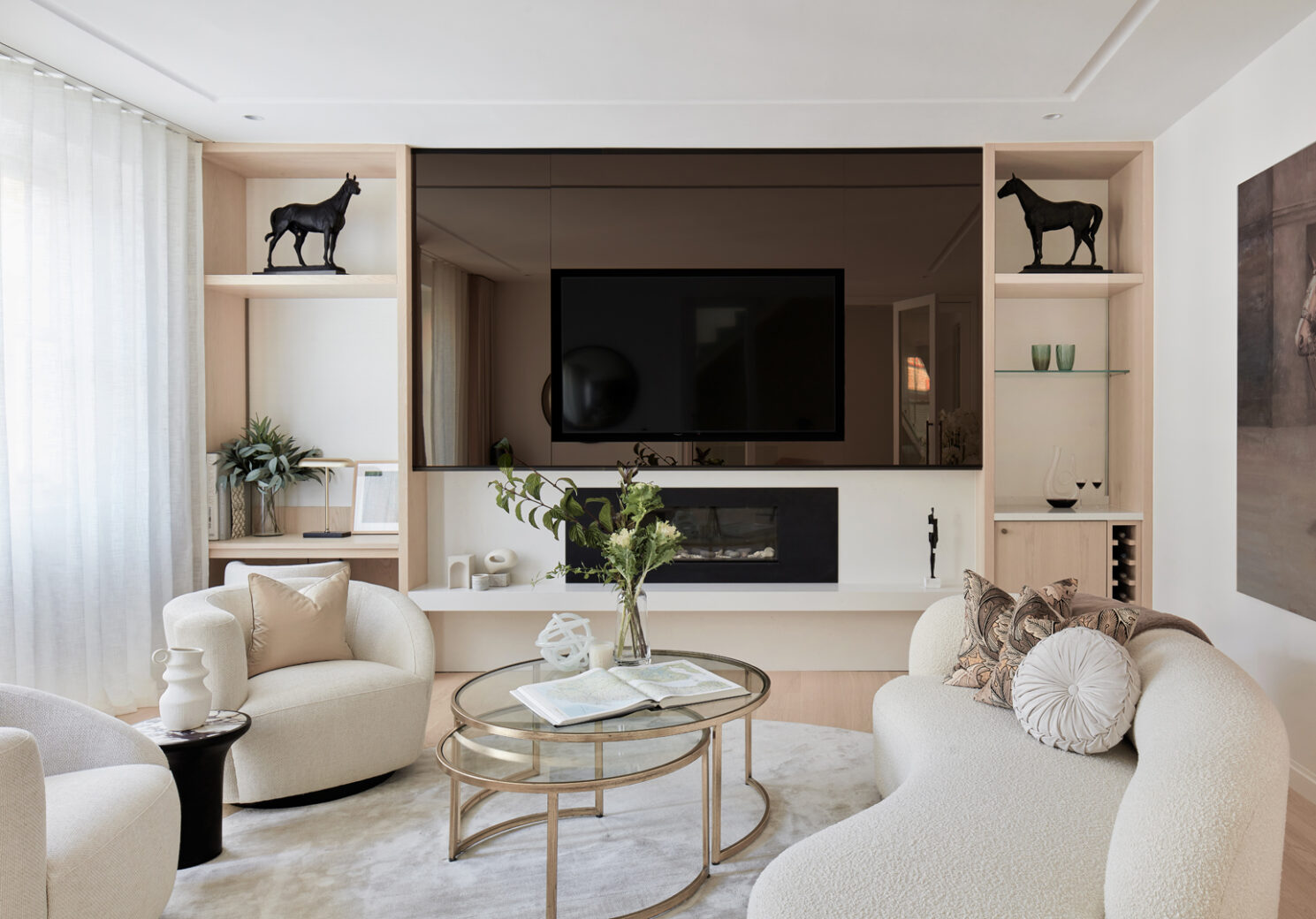 The reworked floor plans take in a series of flowing, flexible living spaces, including two receptions, a media room and a decadent soaring-ceilinged light-filled lower ground entertaining area with cocktail bar and separate snug. Oak floors and beautiful bespoke joinery made by local craft people feature strongly within spaces. Loose furniture and soft furnishings were also sourced from reputable carpet brands who support community and environmental projects.