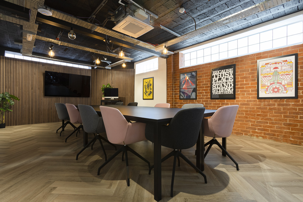 Striking a balance between dark and moody, the office’s industrial chic finishings complement its red brickwork to honour Manchester’s rich industrial heritage. Sleek greys and black painted ceilings, counterbalanced with warm pinks, inject light and freshness into the spaces. Flourishes of the team’s interests and personality adorn the wall of a main office space, including Doodledo branded football shirts and art prints, which reflect the people behind the team and amplify the homely design.