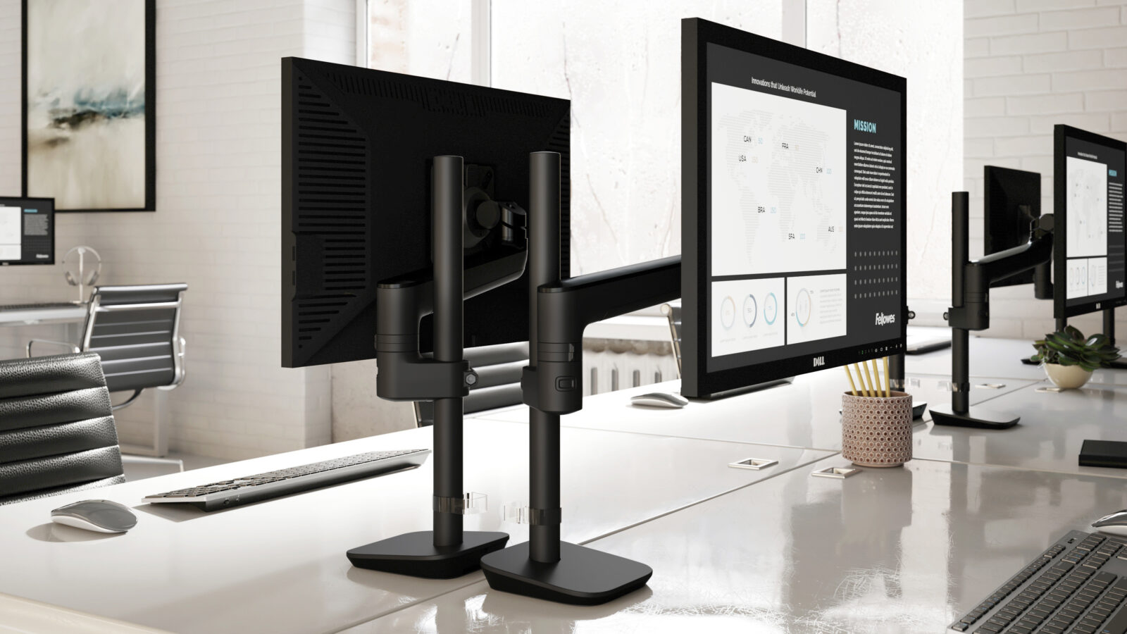 Blending the lines between form and function, and refusing to compromise on either, Fellowes created a monitor arm system that places a higher emphasis on design and aesthetics, redefining the monitor arm as a piece of functional beauty that enhances any workspace. Rising™ is the most comprehensive range of monitor arms on the market, meticulously designed to combine unparalleled, sophisticated construction with no-hassle installation and superior functionality to bring higher performance and improved aesthetics to workplaces.