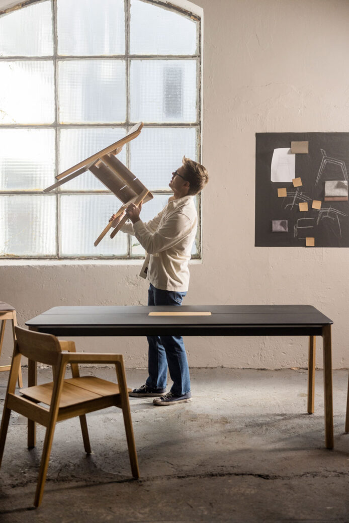 Fora Forms’ new family of solid wood furniture, Knekk, now consists of chairs, bench barstools, and tables. The original design of the Knekk barstool was to facilitate creative workshops. The family still wants to create engaging collaboration and social meeting spaces through the subtle design feature of tilting the user forward. The young designer Jon Fauske’s vision, was that tipping the user would ensure engaged and attentive participants in these processes.