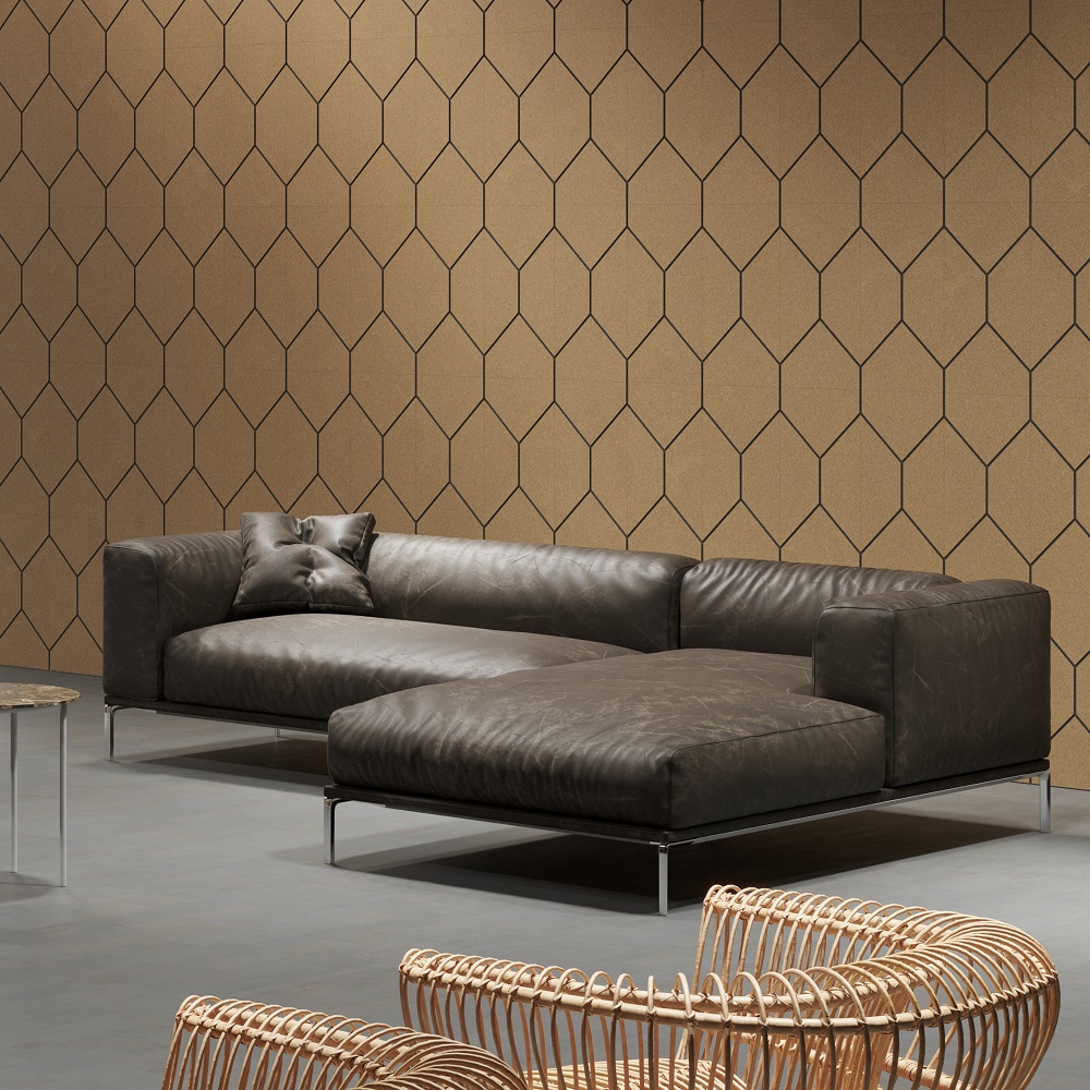 Made entirely from 100% post-industrial recycled cork, Groovy’s linear design is CNC grooved into its face then dyed in one of seven colours. Building a hexagonal motif across the wall, Groovy’s air of retro is equally balanced by cork’s natural aesthetic for a look that feels entirely modern.