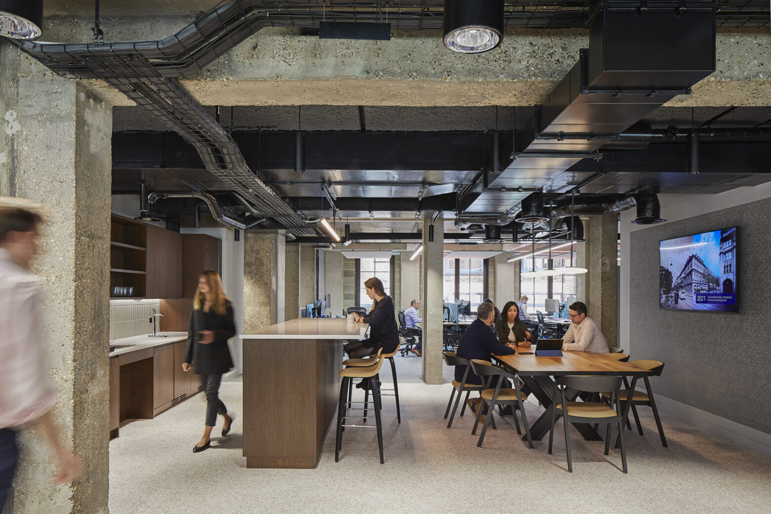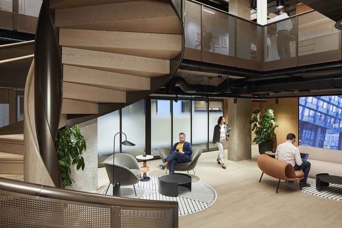 Designed by HLW, Julius Baer’s new office location reflects the company’s ambition to attract young entrepreneurs and employees. Whilst offering an opportunity to engage in the local community and a focus on an elevated client experience, the aim was to provide a best-in-class environment for visitors and staff alike. Sustainability and wellness were at the forefront of the new Julius Baer initiatives, and the project overall targeted a BREEAM Very Good rating. The interior fit out was designed to work seamlessly with the base build’s unique characteristics, while also reflecting high quality craftmanship in the social and collaborative areas that punctuate all floors.