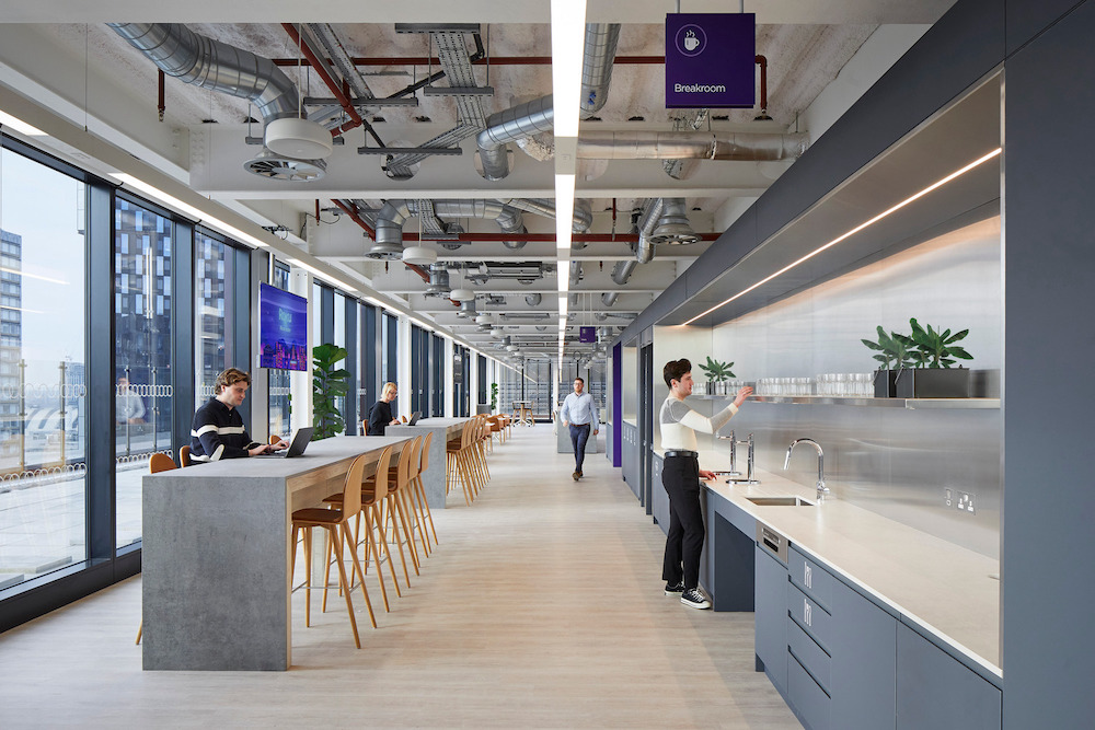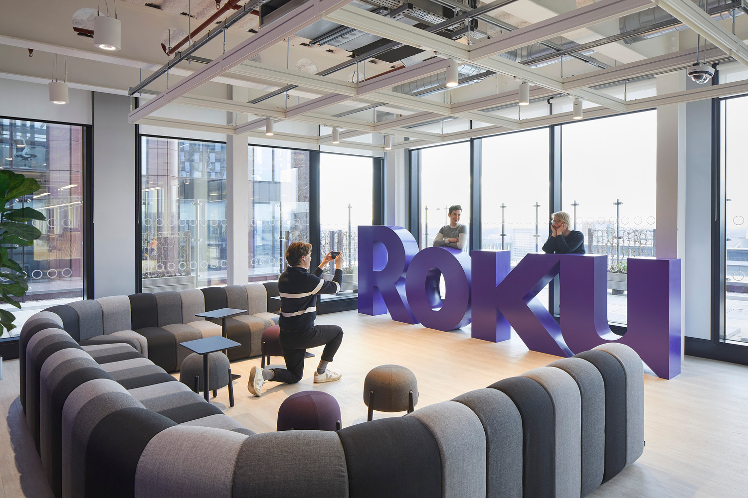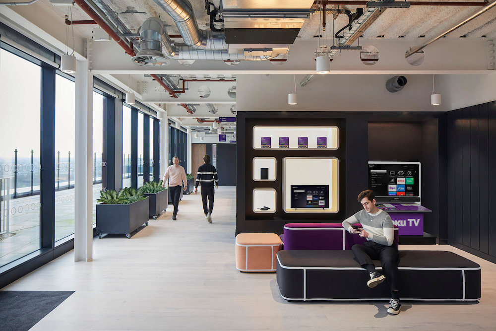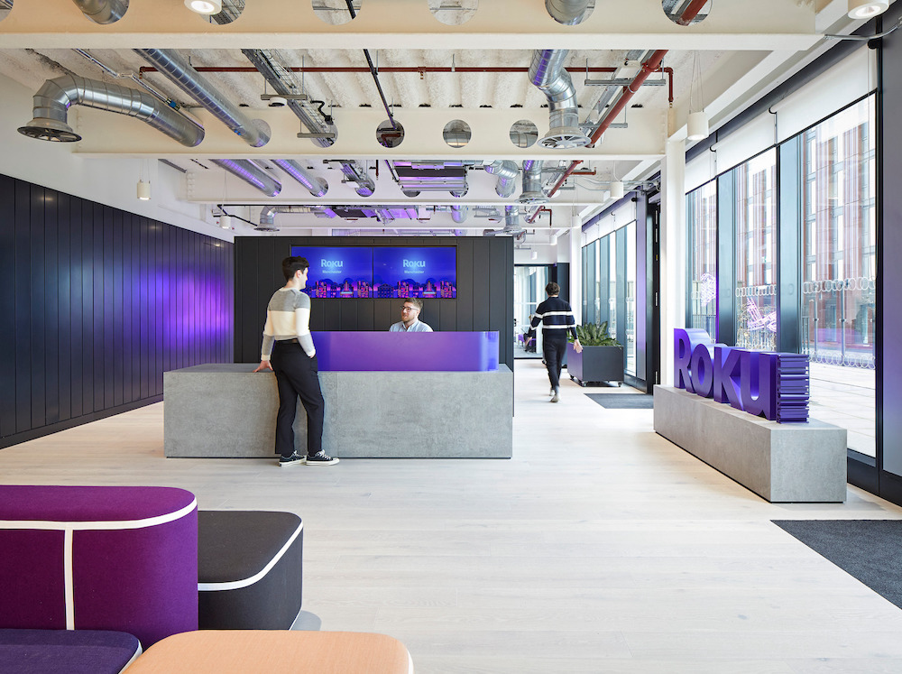 “We are better together” says US streaming giant Roku. Their new Manchester office, located in the heart of the city’s innovation district Circle Square, makes people want to come to work. A spacious working environment, cutting edge technology laboratories, acoustic chambers and clients welcome space compliments social hubs offering an awesome snack provision and a weekly lunch served in the sky terrace. Global branding and Roku purple combined with Manchester neighbourhoods, history and entertainment themes have been applied via immersive graphics throughout the space plus floor and meeting room names. A generous events space allows the flexible of hosting global All Hands meetings and external tech events. The interview suite gives interviewees a taste of their future working environment and show case of Roku products.