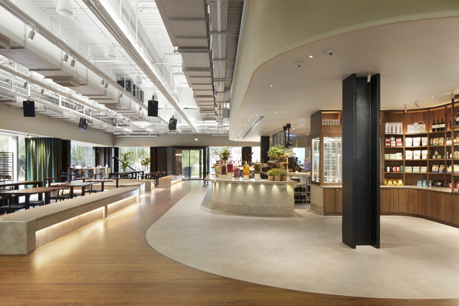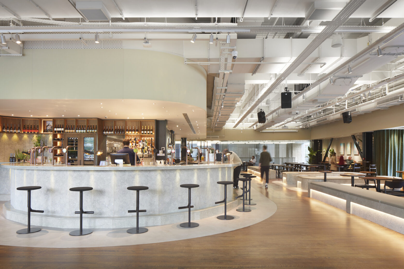 Conceived as an extension of the public realm, Corner at Tate Modern links London’s iconic Southbank and Turbine Hall into a vibrant space for food, drink, and community, emphasising accessibility and inclusivity. The design transitions from a daytime to night, embodying adaptability. Circular economy, decarbonisation and social impact were all at the core of the project, encouraging the preservation of original materials such as timber flooring, alongside the exposure of the building’s structural elements, to celebrate its post-industrial essence.