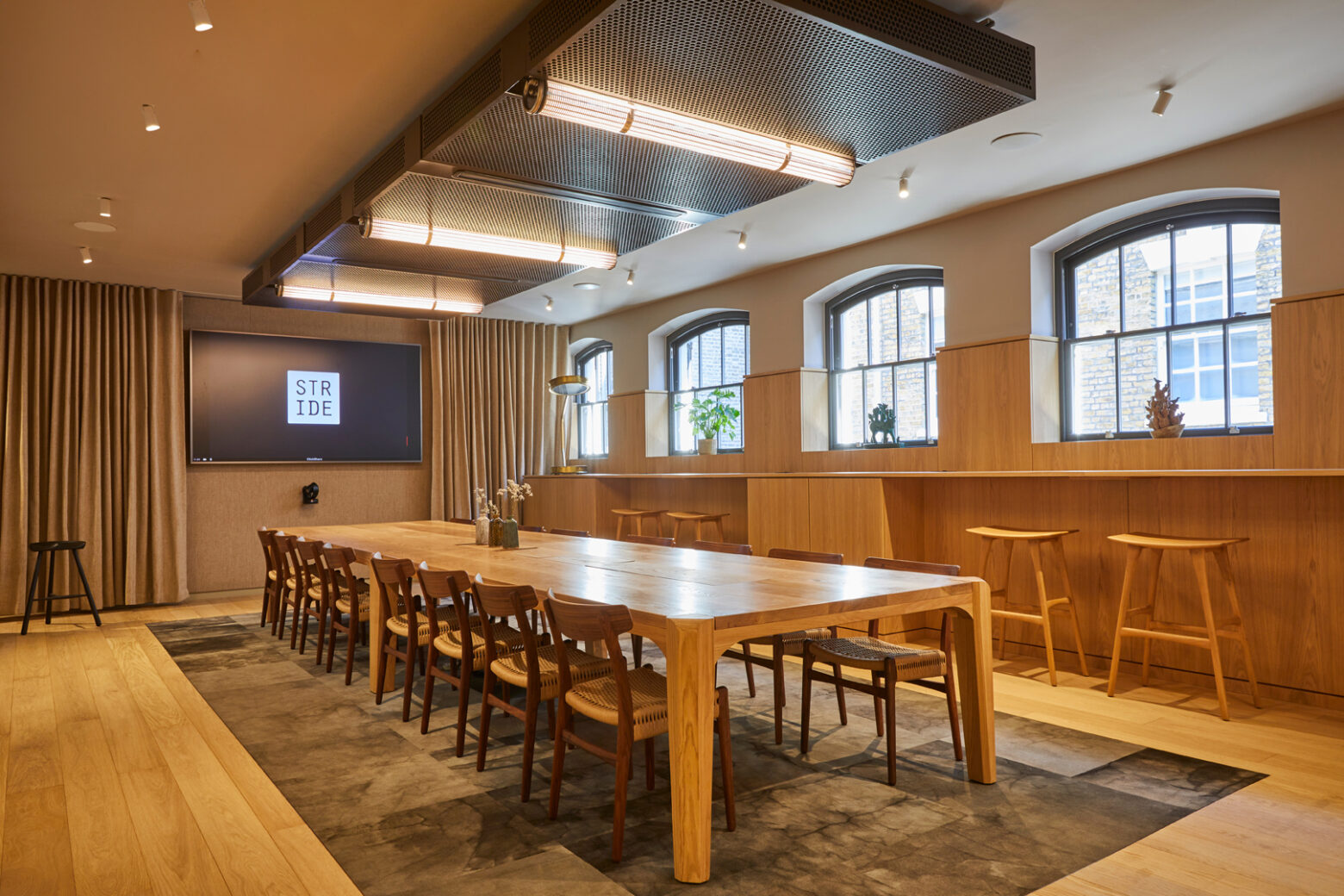 Stride.VC, a venture capital firm dedicated to supporting budding entrepreneurs, commissioned HOP to create their very first workplace, with a brief of prioritising comfort, style and wellness, combining residential warmth with high end hotel-like amenities. To execute this brief, HOP worked with lead designer Haley McLane and Stride.VC to create a calming, yet bold and human-centric design. Combining the craftmanship and minimalism of Japandi interiors with the rawness of modern industrialism, dark and dramatic features perfectly complement a neutral backdrop of natural materials and a gentle colour palette.