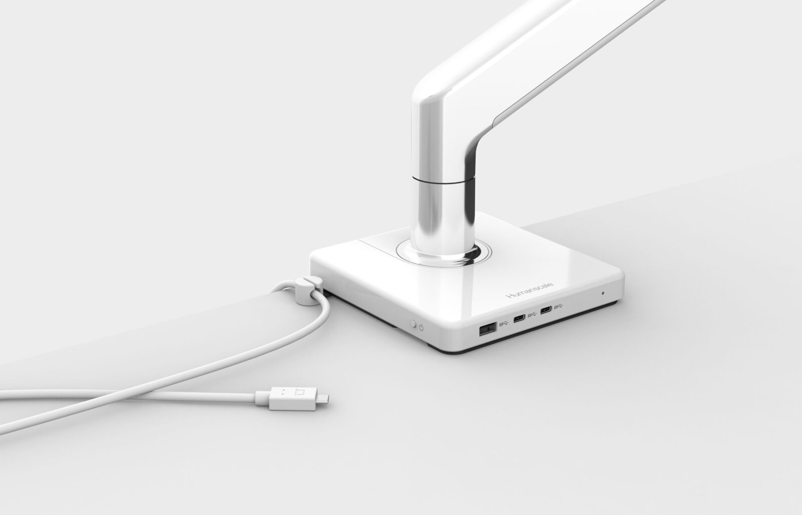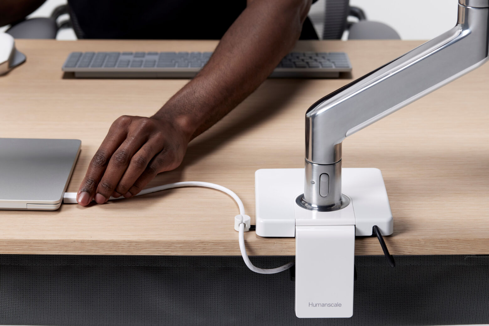 Designed to match the varying technological needs of today’s workspaces, M/Connect 3 is a three-pronged solution to data and power connectivity. M/Connect 3 is a centralised hub for connecting data and power to laptops and handheld devices. A tool for the agile and technological needs of today, M/Connect 3 improves access to essential ports while reducing cable clutter. Its modular design allows it to not only be easily serviced when needed, but seamlessly upgraded to match rapidly evolving trends. Designed with efficiency in mind, M/Connect 3 takes up minimal space, increasing usable space on any worksurface. In all models, essential ports are made accessible, with two ports dedicated exclusively to high-speed charging. MC3 is plug and play, with no drivers needed and is designed to integrate into Humanscale monitor arms or work as a standalone solution.