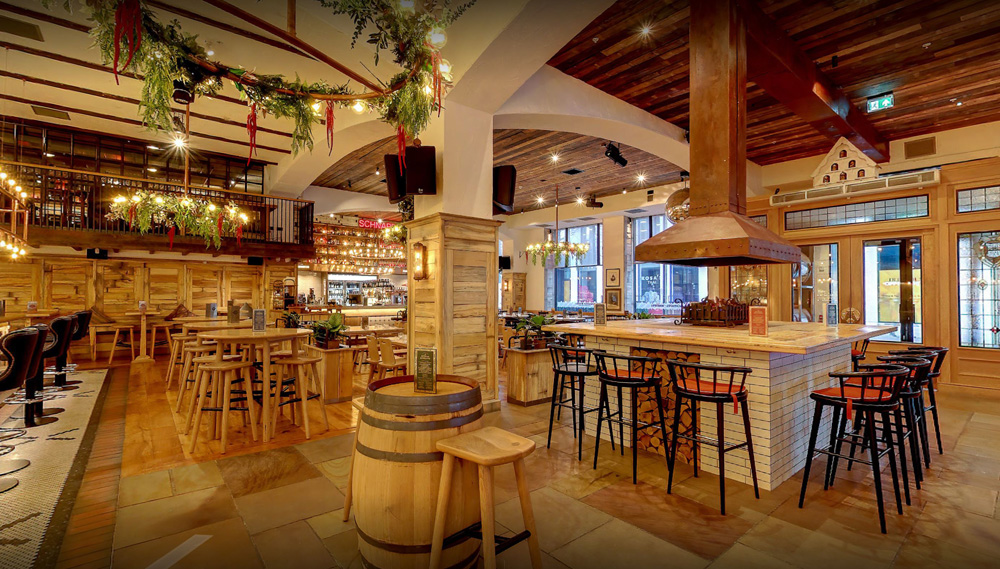 An open fire greets you upon arrival and the main bar is the focal point with its stacked copper tanks of fresh Pilsner Bier, along with the stage which provides live entertainment seven days a week. Exclusive to Birmingham is Ludwig’s Tavern Bar, which is home to a Schnapps bar, shuffleboard and ski lodge board games along with an impressive mezzanine balcony space with prime view over all of the action.
