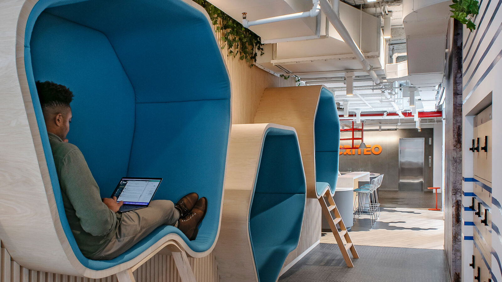 The project coincided with Criteo’s re-brand, allowing K2 Space to integrate the new corporate identity into the design, referencing the new shape vocabulary in key areas such as the cafeteria and reception and immediately immersing visitors in Criteo’s vibrant culture. Alongside economic and social benefits, there were also significant environmental benefits to the new space – LED’s replacing fluorescent bulbs, the extensive use of 2nd-hand furniture and the sourcing of local joinery to reduce carbon emissions. The project also included bespoke features that reflect the company culture, such as the campfire meeting spaces and a curved tea point designed to encourage informal gatherings and collaboration. These elements not only enhance the aesthetic appeal of the office but also promote a sense of identity and cohesion within the workplace.