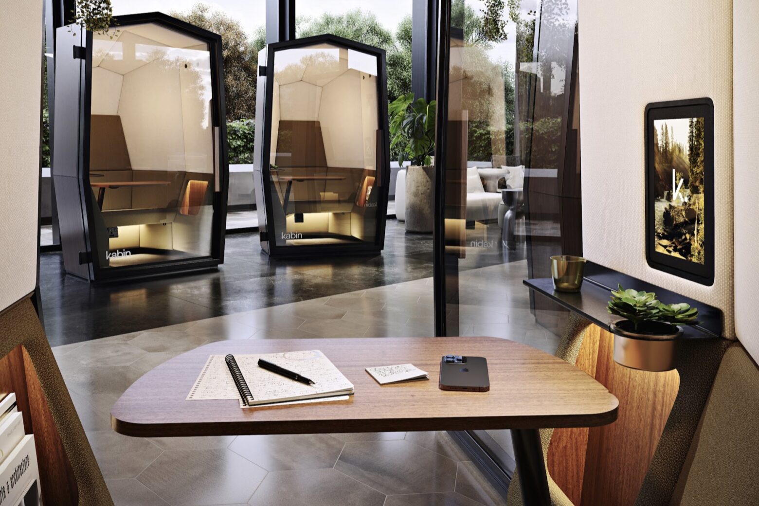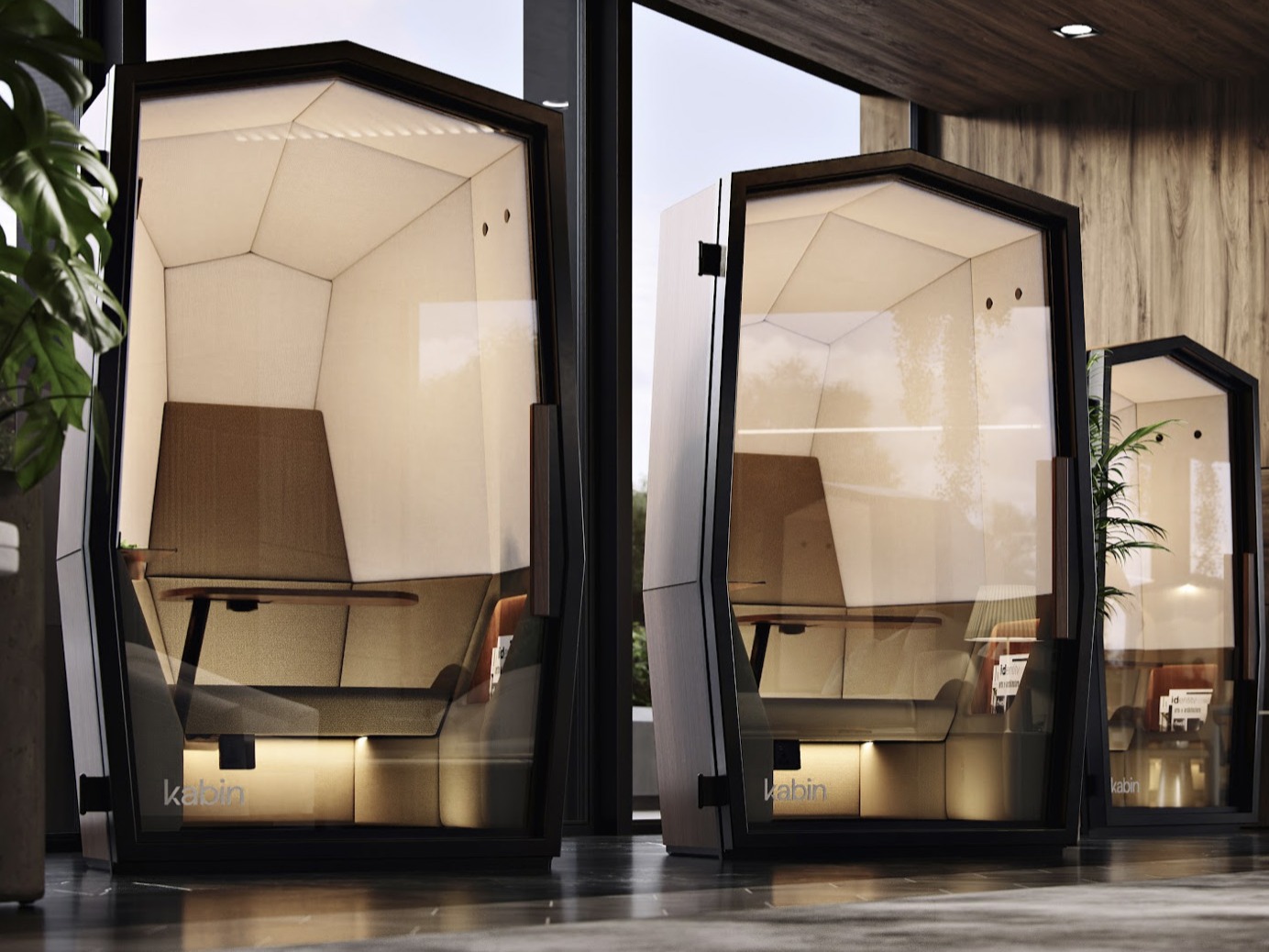 Think VIP lounge or first-class cabin aesthetics: Kabin is manufactured and crafted in the UK with functional and highly sophisticated interiors. This new generation ‘pod’ responds to the increasing need for privacy in open spaces, as we are now working in a multitude of public locations, such as hotel lobbies, airports, restaurants, coffee shops and plazas.
