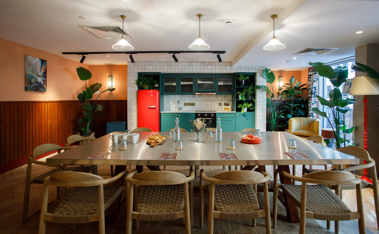 Room2 Belfast opened its doors in 2023, an eclectic hometel creating a hospitality exerprience where guests can enjoy a plethora of homely amenities alongside customary hotel luxuries. The look and feel of the hometel captures both the city’s rich heritage and vibrant present with its bold and playfully patterned soft furnishings offset by warm-toned natural timbers. Each cosy guestroom is fitted with a small but highly efficient kitchenette as well as a communal kitchen to suit guests who are checking in for extended stays. The design concept celebrates local crafts people with its curated art collection lining the walls throughout, all the while maximising the use of sustainable and circular waste products in the property’s materiality.