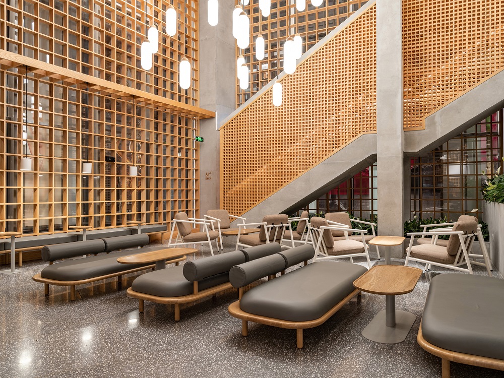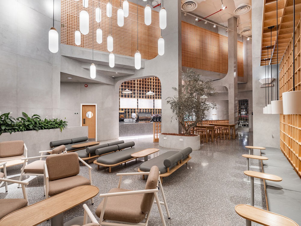 To complement the building’s brutalist-like edifice, floor-to-ceiling concrete columns have been incorporated within the design, softening the minimalist appearance by introducing curves where the columns join with horizontal beams. To achieve a relaxed setting, materials such as terrazzo for the floors, and oak for the grid-like dividers, screen walls, and window louvres are used throughout. Low, wide profile benches and sofas are reminiscent of Japanese design and adds to the ‘Japandi’ aesthetic, creating a unique style which befits the brands pre-eminent position in the Middle East’s specialty coffee culture.