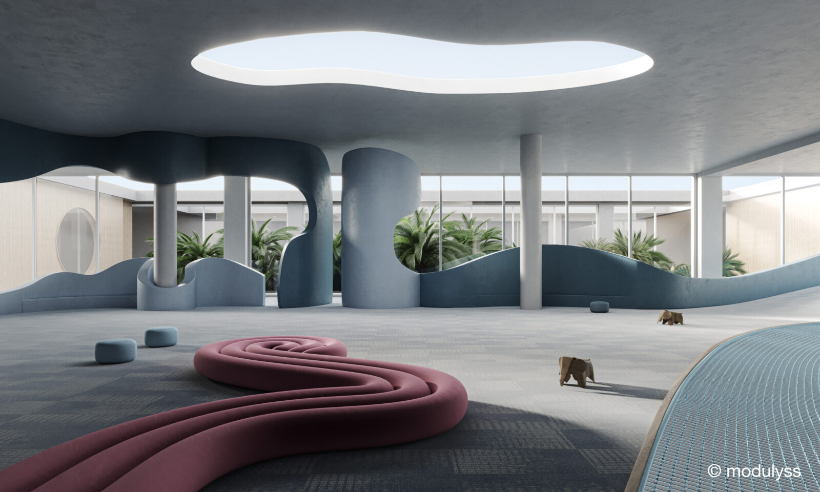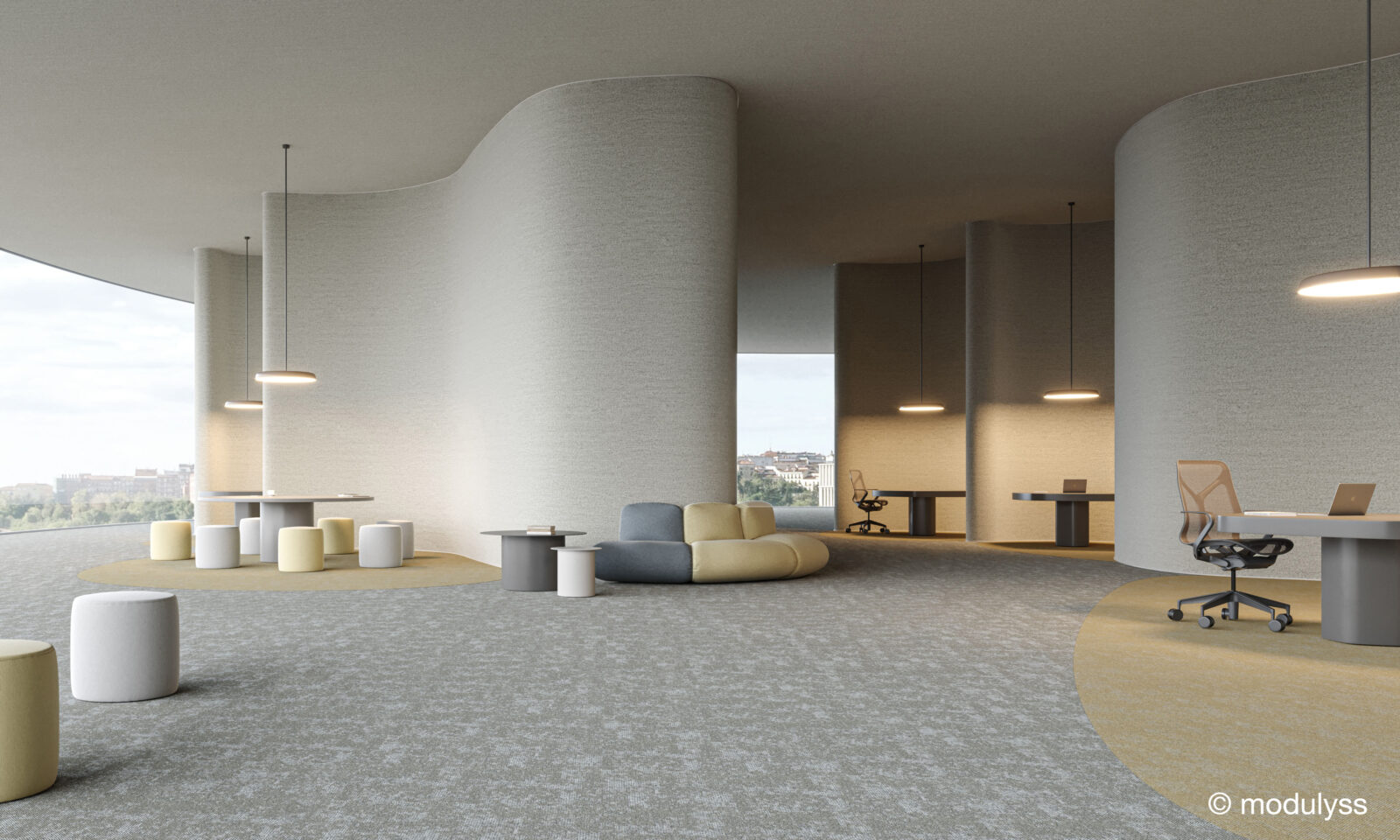 Committed to circularity, Modus joins modulyss ‘Cradle to Cradle Certified’® collections, ensuring both aesthetic appeal and environmental responsibility. Modus lets us explore limitless possibilities, ideal for diverse applications in commercial, residential, and rental properties. The innovative aspect of the Modus collection lies in its composition and specific construction. Through the utilisation of a new yarn construction and a dematerialised backing, the carpet tile collection not only meets all requirements for commercial flooring but also reduces material usage without sacrificing design integrity.
