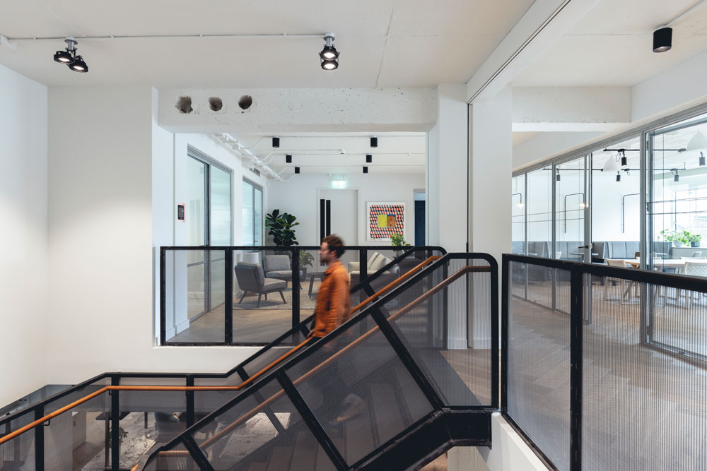 Due to the buildings position, the floors are filled with an abundance of natural light, which the design was consciously shaped around to maximise user wellbeing. Galvanised steel framed partitions add acoustic separation between areas whilst simultaneously allowing light to spill through the space. Further enhancing user wellbeing, are the exercise room and the terrace, which adjoin the dedicated informal collaboration space.