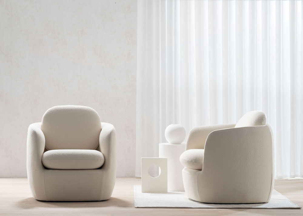 Bilbao, a contemporary and curvaceous swivel tub chair, offering a generous sitting space amongst plump, pebble-like cushions. The Bilbao chair combines crisp defined edges with gentle, organic surfaces. Tim Rundle and Morgan sought to create a chair with a solid, yet sensuous presence, being fully upholstered and planted on the ground. Through its luxurious soft forms, Bilbao evokes a retreat-like atmosphere in commercial spaces, including hospitality, cruise and workplaces.