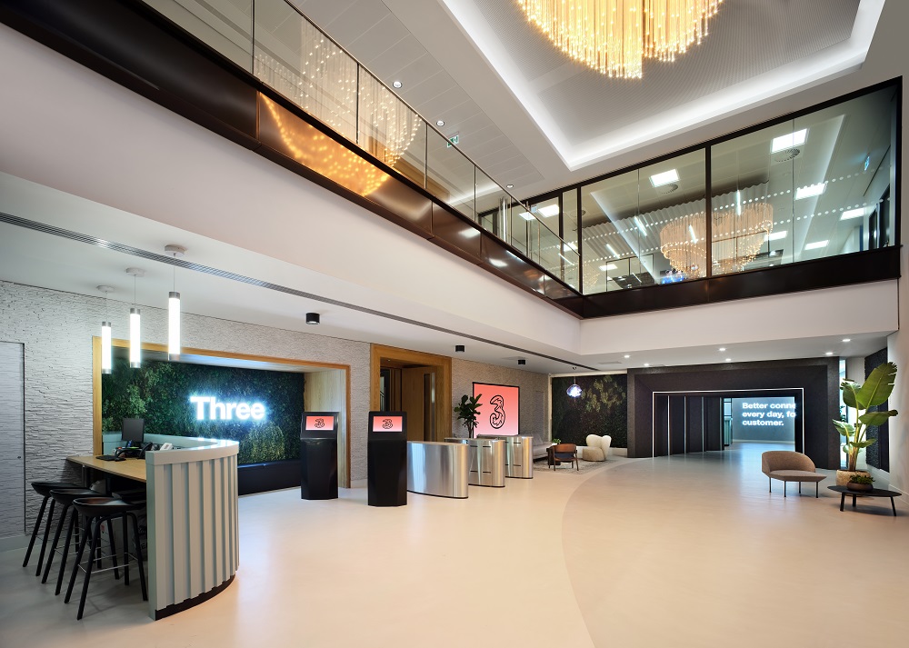 Visitors to the offices encounter an illusion chandelier depicting Three UK’s logo in 500 acrylic rods, suspended in the high-tech reception area. The reception design and build integrates with a smart app and connects visitors with their host.