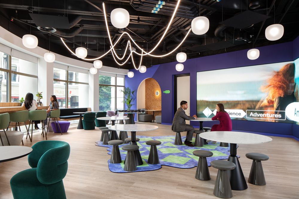 Designed by Oktra, Paysafe’s London office creates a connected, inclusive, and engaging environment across two floors, linked by an internal staircase to encourage movement and collaboration. The workspace features a range of social and functional areas, including a library, cinema, and all-hands space, alongside playful elements such as swings to foster creativity. A quiet zone enclosed by a semi-transparent partition provides acoustic privacy while maintaining visual connection. Bold branding, design cues from Paysafe’s Jacksonville office, and a prominent LED theatre enhance global identity. Originally targeting Ska Silver, the project achieved a Ska Gold sustainability rating.
