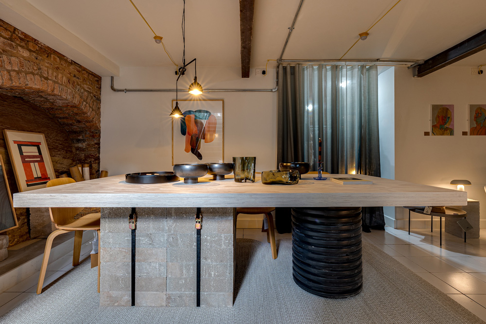 ōH Concept lifestyle pop-up is a curated retail store and experience space dedicated to fostering a community of design lovers, coffee drinkers and conscious shoppers. Faced with the challenge of designing a temporary and flexible space, MONIKA Studio based its concept on the principle of designing for disassembly and placed importance on the idea of reusing and upcycling materials. As the space was previously fitted out as a hairdresser salon, items such as hairdressers’ mirrors, glazed screen dividers or footrails have been repurposed to create installation pieces to redefine the use of the space. An iroko wood table is the focal point of the store, which has been constructed out of shredded old doors remaining from the previous project.