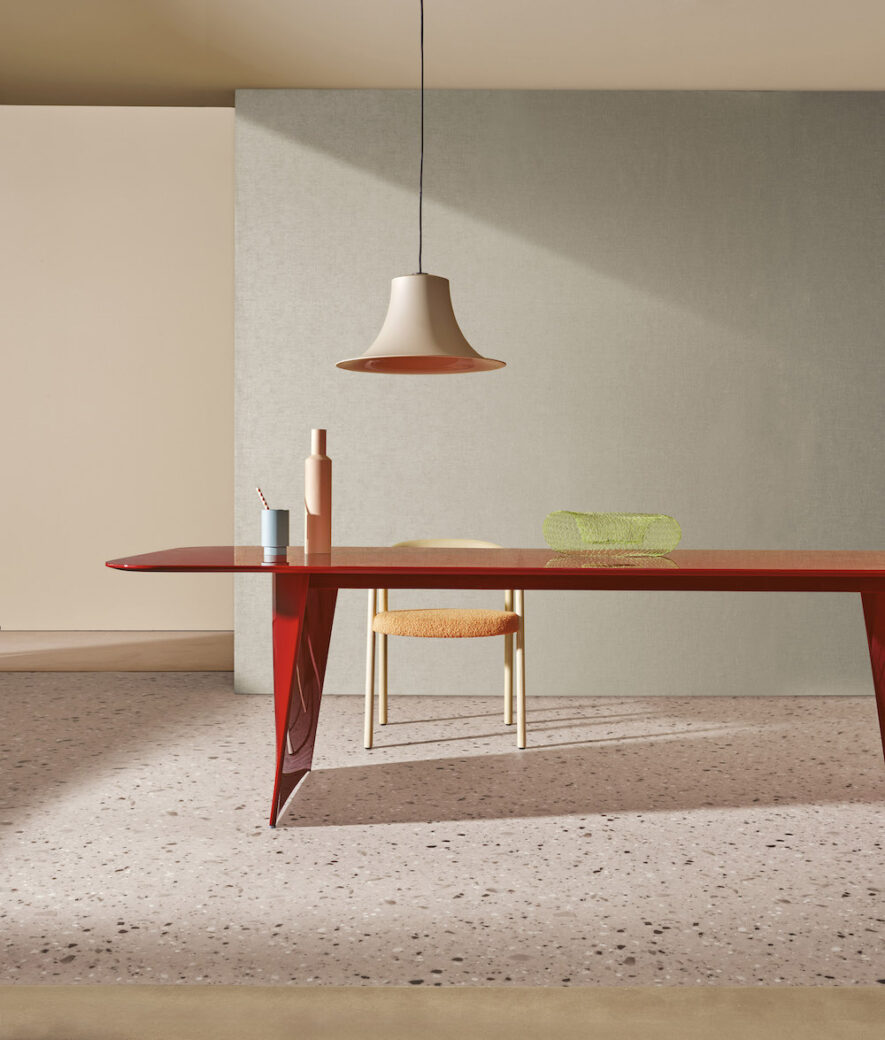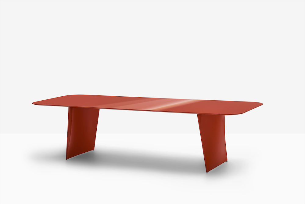 Frank table is inspired by architectural shapes and industrial materials. Together, rational lines and curves contribute to an image of lightness and contemporaneity. The structure on which the top rests is made up of two slightly curved die-cast aluminium bases with variable thickness, the perception of which varies according to the point of view. Seen from the front they are slightly arched and resemble the shape of a sail, creating a light and ethereal optical effect. Seen from the side, the volume appears full. The bases taper towards the bottom, reaching the ground in a less accentuated curve and is connected by a sturdy steel beam, placed under the top. The rectangular top, with rounded corners, available in different materials and finishes, gives a further sense of lightness to this large table, which can be placed with ease in living rooms and meeting areas, bestowing the spaces with personality.