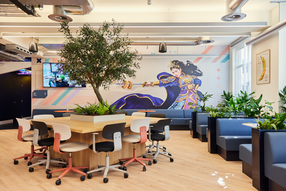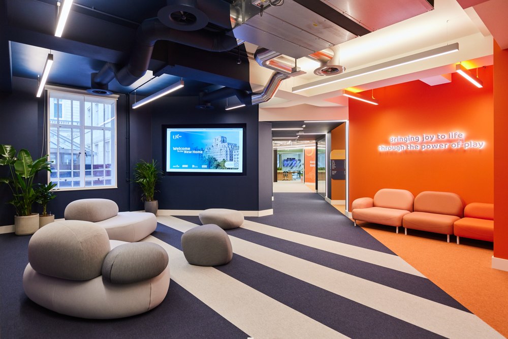Peldon Rose designed a new workspace for Aristocrat, uniting its brands u2013Anaxi, Pixel United, and Product Madness u2013 under one roof for the first time. The brief required a versatile and subtly branded environment that equally represented all four companies. The resulting design reflects each brand’s identity while fostering a cohesive and adaptable workspace. Sustainability was central to the project, with a significant amount of furniture and fittings reused from two different offices, including lighting and ceiling panels creatively repurposed. The space supports both collaborative and informal working styles, balancing functionality with minimal environmental impact.