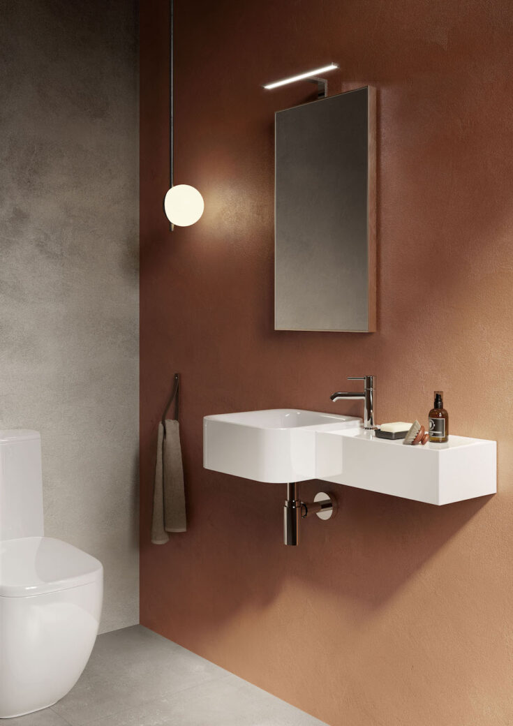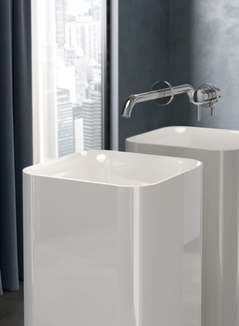 The RAK-Petit collection includes deep-based washbasins that can be installed alone or combined with RAK-Joy vanity units in the domestic bathrooms, as well as freestanding washbasins that are statement pieces.