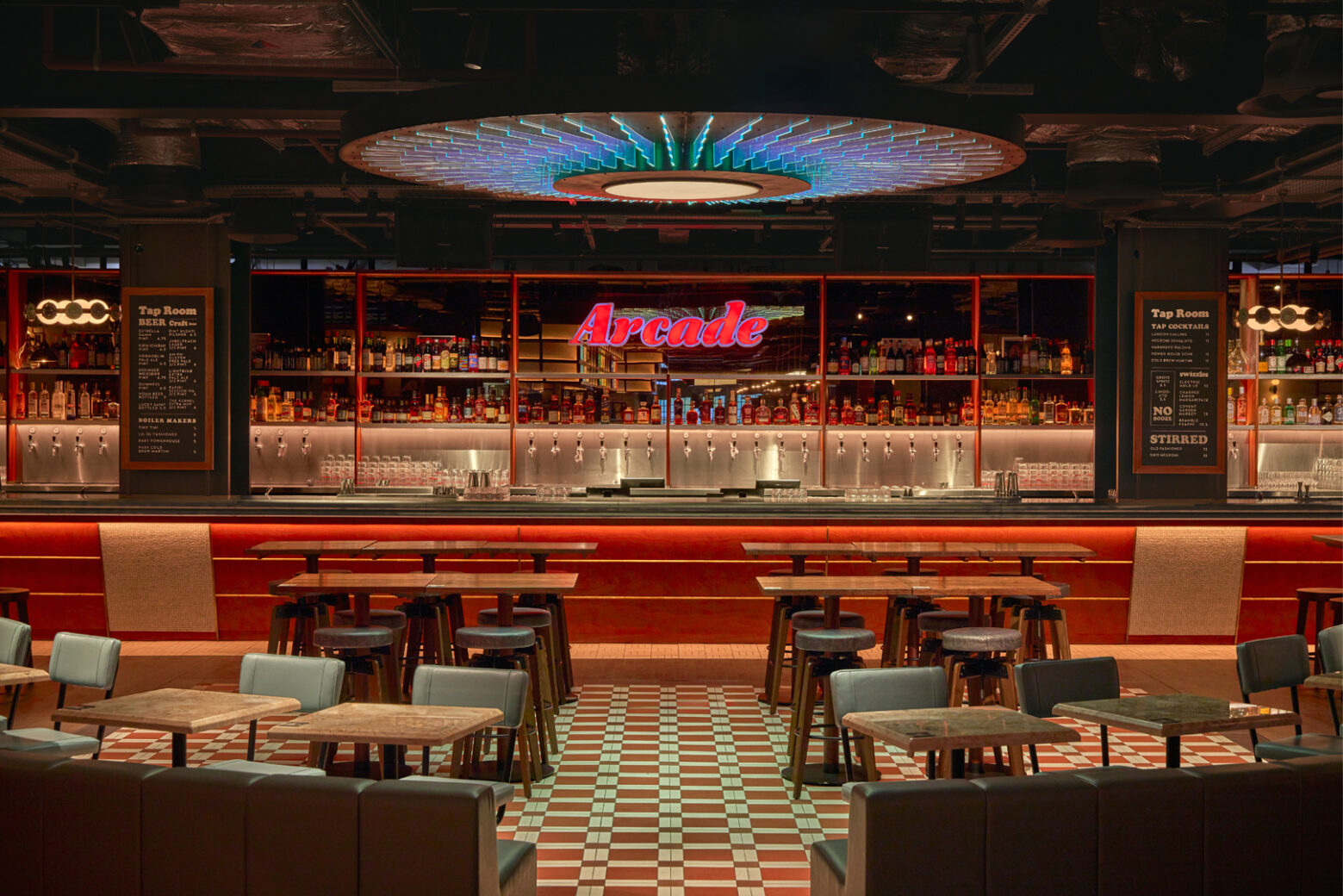 The Arcade Food Hall at Battersea Power Station blends American dining with touches of Italian and Oriental influences, through a careful selection of warm, earthy tones and opulent textures, the interiors were designed to exude comfort and elegance. Furnished with rustic Italian-inspired arches and delicate Oriental screens, the layout of the food hall encourages social interaction and exploration, with open spaces inviting patrons to gather and enjoy the diverse culinary offerings. Meanwhile, intimate alcoves and seating arrangements offer moments of privacy and tranquility. Overall, the project seats 500 people and features 13 cuisines, two bars, three restaurants, and a private dining room on the first level.