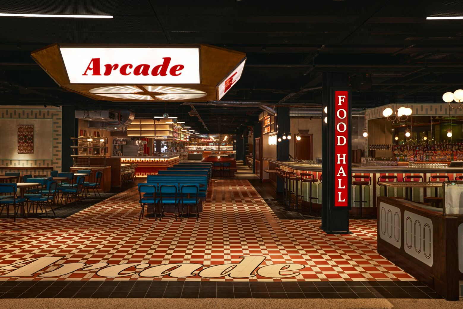 Innovative approaches to tile installation were also pivotal in the creation of the Arcade Food Hall’s bespoke panels: leveraging advanced water jet cutting technology, the project team meticulously customised the porcelain tiles to fit seamlessly into predefined panels, optimising material usage and consciously minimising waste.